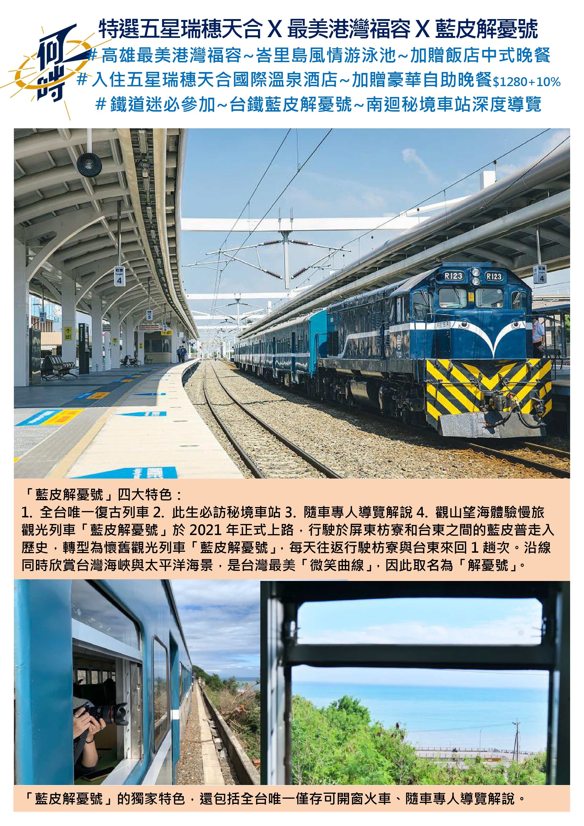 1. 全台唯一復古列車2. 此生必訪秘境車站3. 隨車專人導覽解說4. 觀山望海體驗慢旅。行駛於屏東枋寮和台東之間的藍皮普走入歷史,轉型為台鐵懷舊觀光列車「藍皮解憂號」,每天往返行駛枋寮與台東來回1趟次。是台灣最美的「微笑曲線」,因此取名為「解憂號」。獨家特色,還包括全台唯一僅存可開窗火車、隨車專人導覽解說。