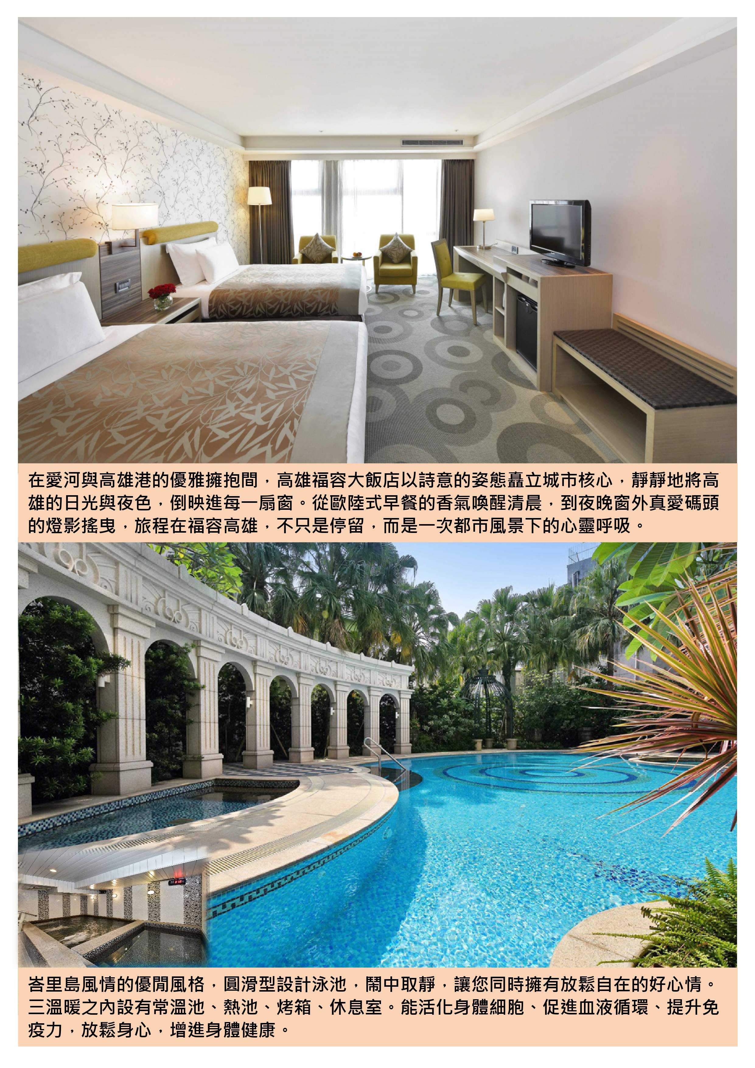 第一晚下榻的【高雄福容大飯店】,位於高雄港都,擁有寬敞空間與細緻服務,給旅人一夜穩穩的幸福感。第二晚入住東部最具話題的頂級溫泉渡假村【瑞穗天合國際觀光酒店】,不僅享有天然碳酸氫鈉泉的療癒泡湯體驗,還貼心加贈價值超過千元的飯店自助晚餐——吃得豐盛、睡得安穩,讓身心真正「泡」在放鬆裡。