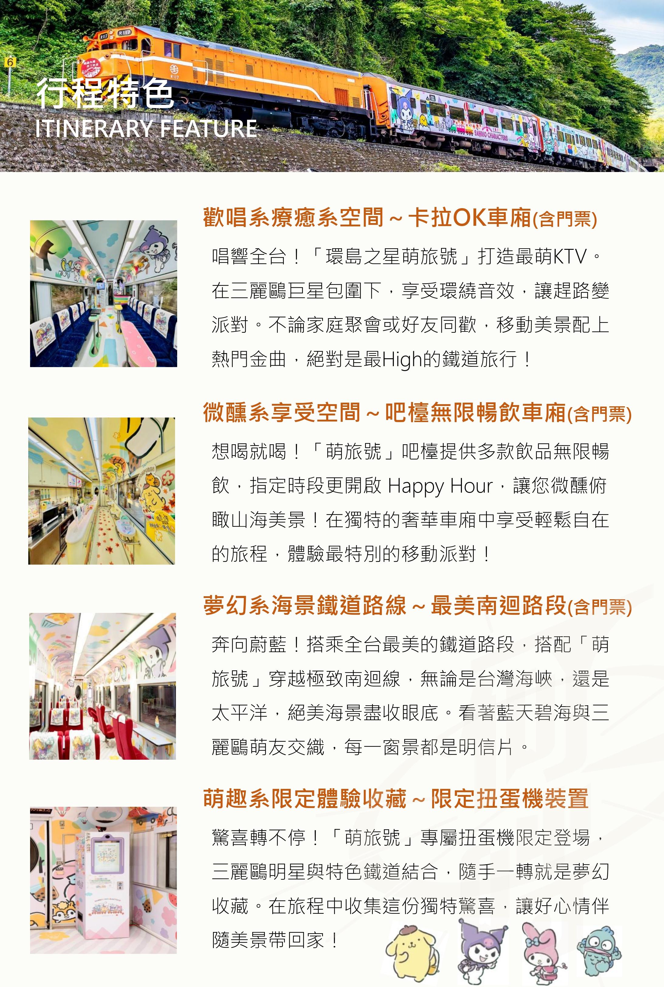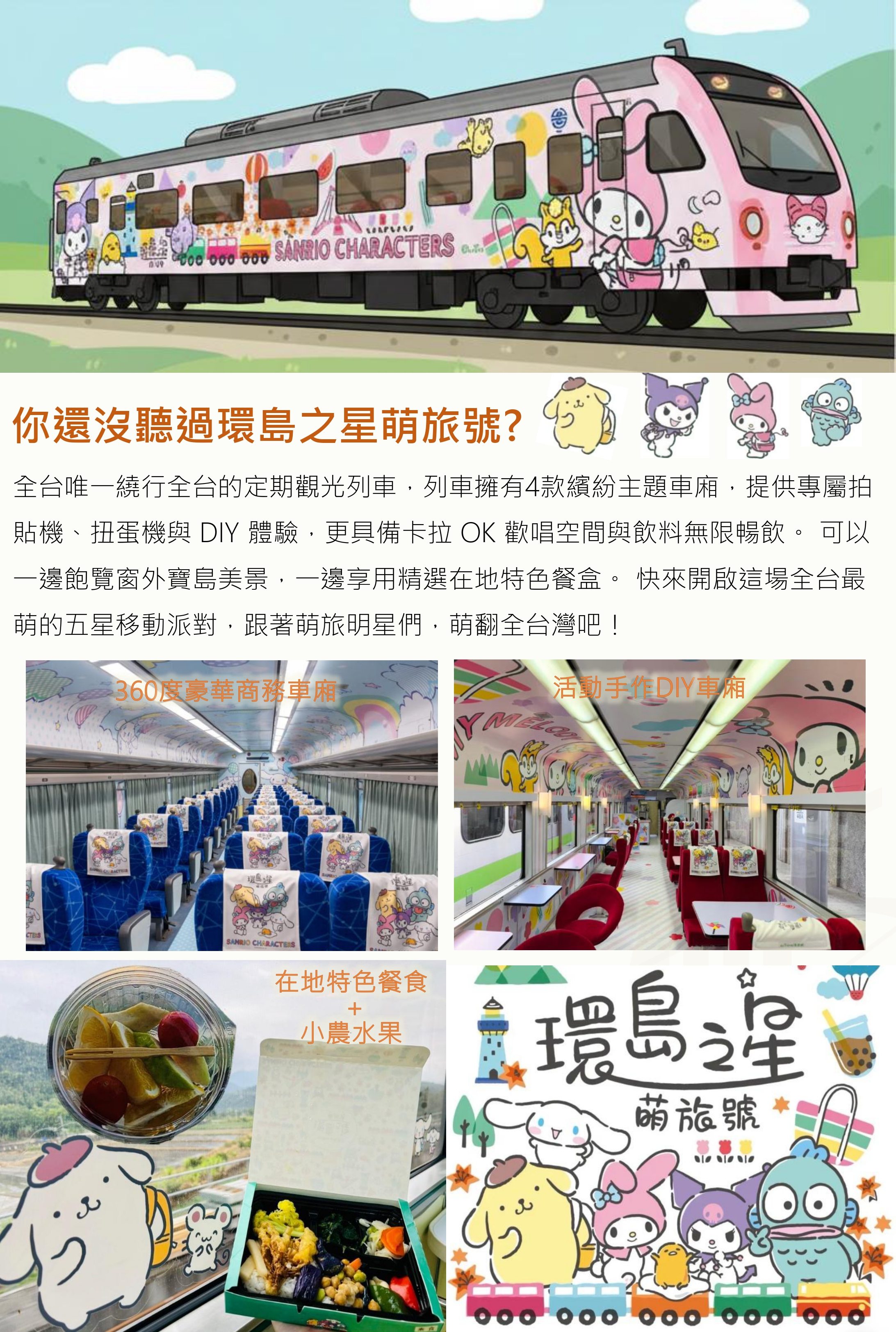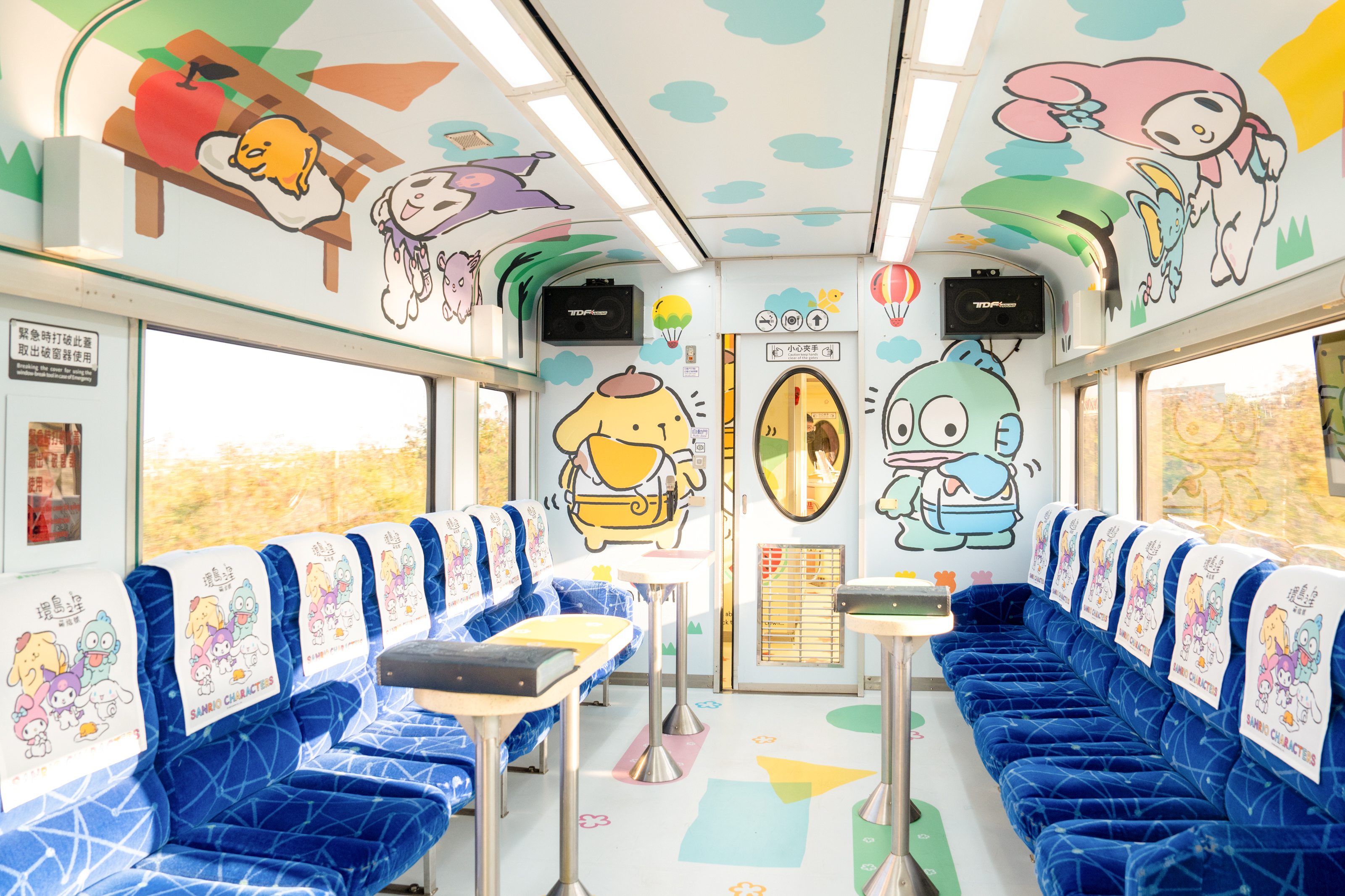 彷彿踏入一部立體的童話繪本。這座由Hello Kitty、美樂蒂與大耳狗喜拿攜手打造的夢幻車廂,在晨光斜照中展現著繽紛角色與台灣風景交融的可愛弧線,車窗上的卡通剪影如歡笑的印記,在舒適座椅間緩緩移動。您可輕觸椅背上刺繡的三麗鷗角色圖案,感受設計師留在織品裡的溫暖巧思;坐在全景觀景窗前眺望,窗外流動的山海美景與車內的可愛佈置,彷彿在進行一場跨越次元的對話;當列車穿過隧道,車廂內會亮起溫柔的星光燈飾,那是夢想與旅程共譜的歡樂語言。