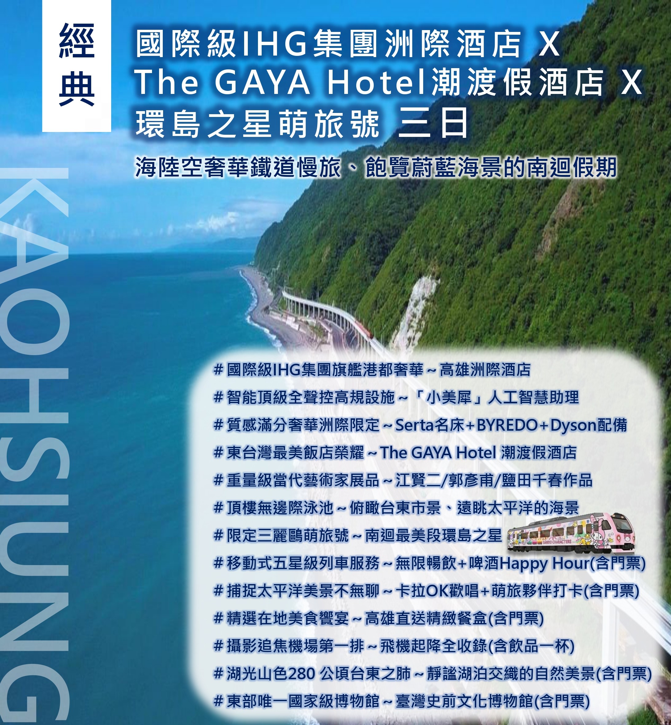 經典IHG集團洲際酒店xThe GAYA Hotelx環島之星萌旅號 三日|海陸空奢華鐵道慢旅、飽覽蔚藍海景的南迴假期 | 4 | NT$8,888 | 可報名 | |