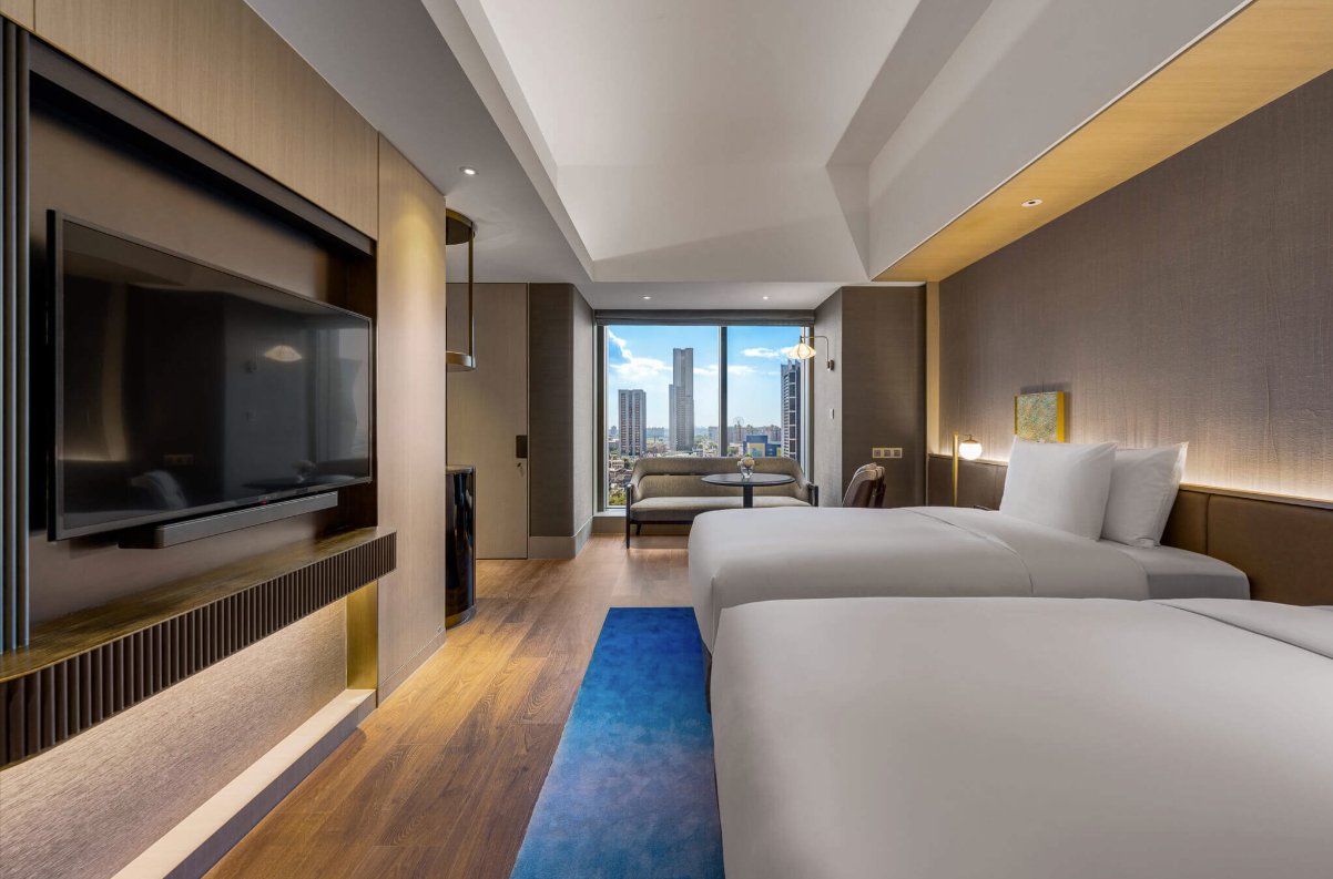 推開豪華雅緻房的霧面玻璃門,彷彿踏入一幀精心構圖的港都立體畫框。這間以「海港晨光」為靈感的空間,將天際線的遼闊與居所的溫潤,凝練成一座懸浮於城市之上的感官棲地——整面落地窗將高雄港的晝夜光影收納成動態壁畫,而室內選用月桃編織與原生木材打造的肌理,則以觸覺溫柔承接旅人的每一次呼吸。您可臥在靠窗的日間榻上,看晨曦如何將遠方壽山輪廓染成黛青色。