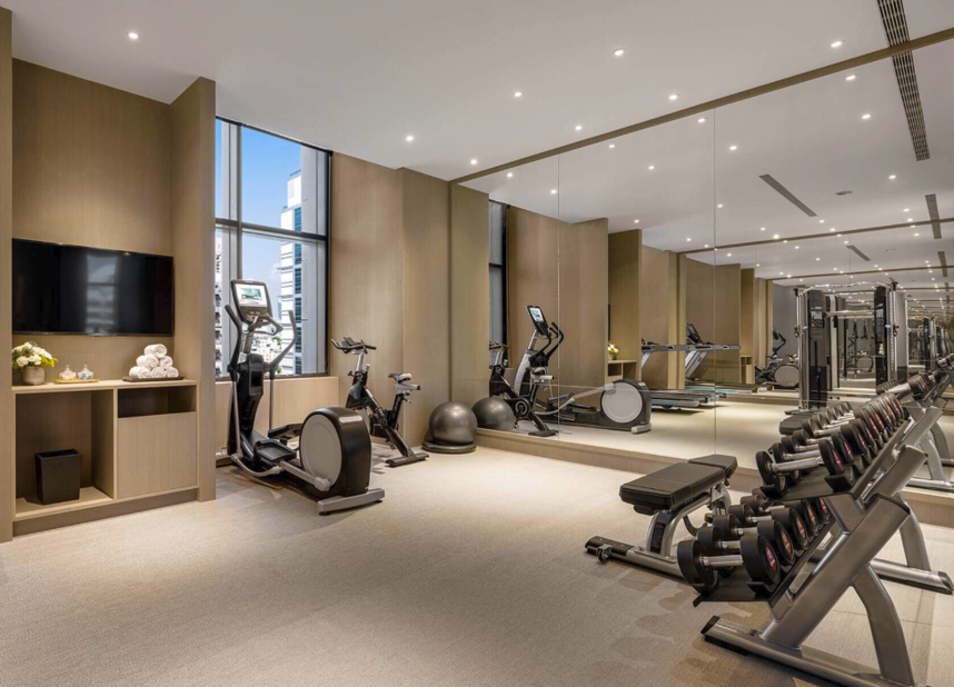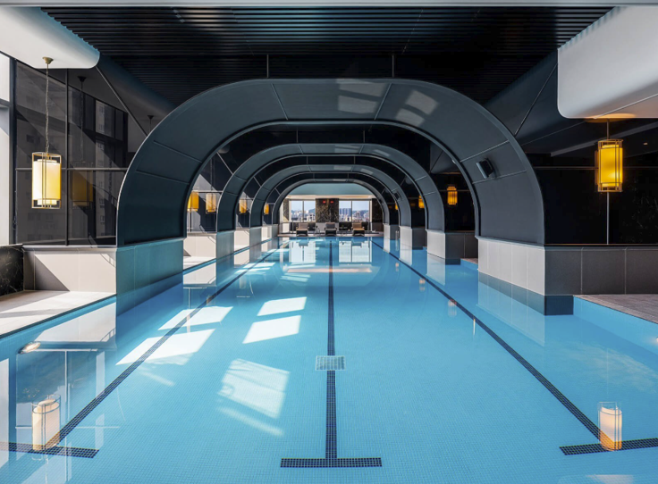 隱身於酒店高樓層的室內溫水池,是一座以光影與水流共構的懸浮宇宙。當您推開霧面玻璃門,28度的恆溫水汽如薄紗般輕擁而上,天光從挑高十米的玻璃穹頂傾瀉而下,在水面碎裂成千萬片搖曳的琉璃——這座25公尺長的無邊際泳池,彷彿一道漂浮在城市上空的液態銀河,池底的馬賽克鑲嵌著高雄港古地圖的銅金色航道,游動時波紋便重新描繪著這座海洋城市的歷史經緯。