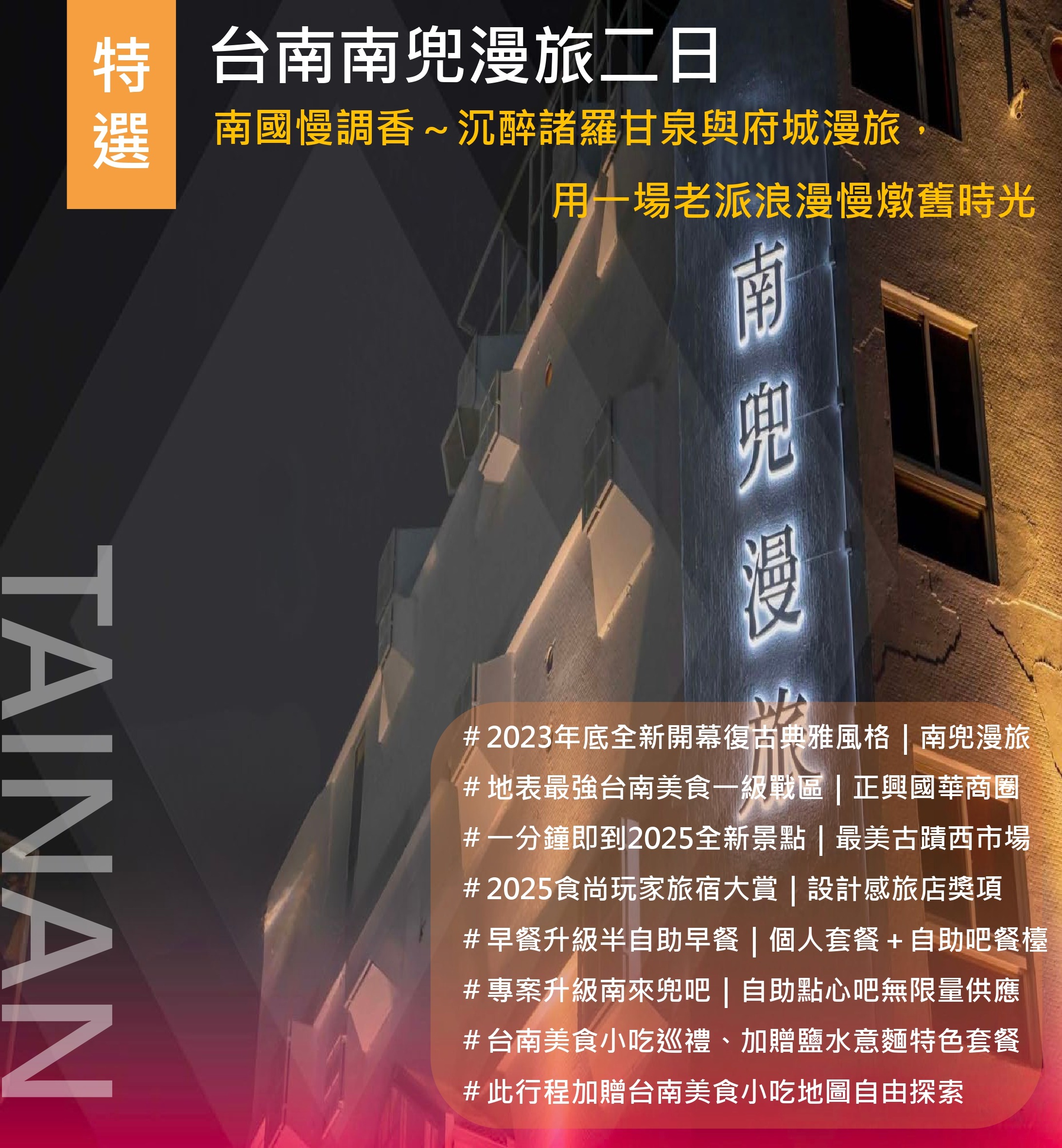 特選台南南兜漫旅二日|南國慢調香~沉醉諸羅甘泉與府城漫旅,用一場老派浪漫慢燉舊時光 | 32 | NT$2,999 | 可報名 |