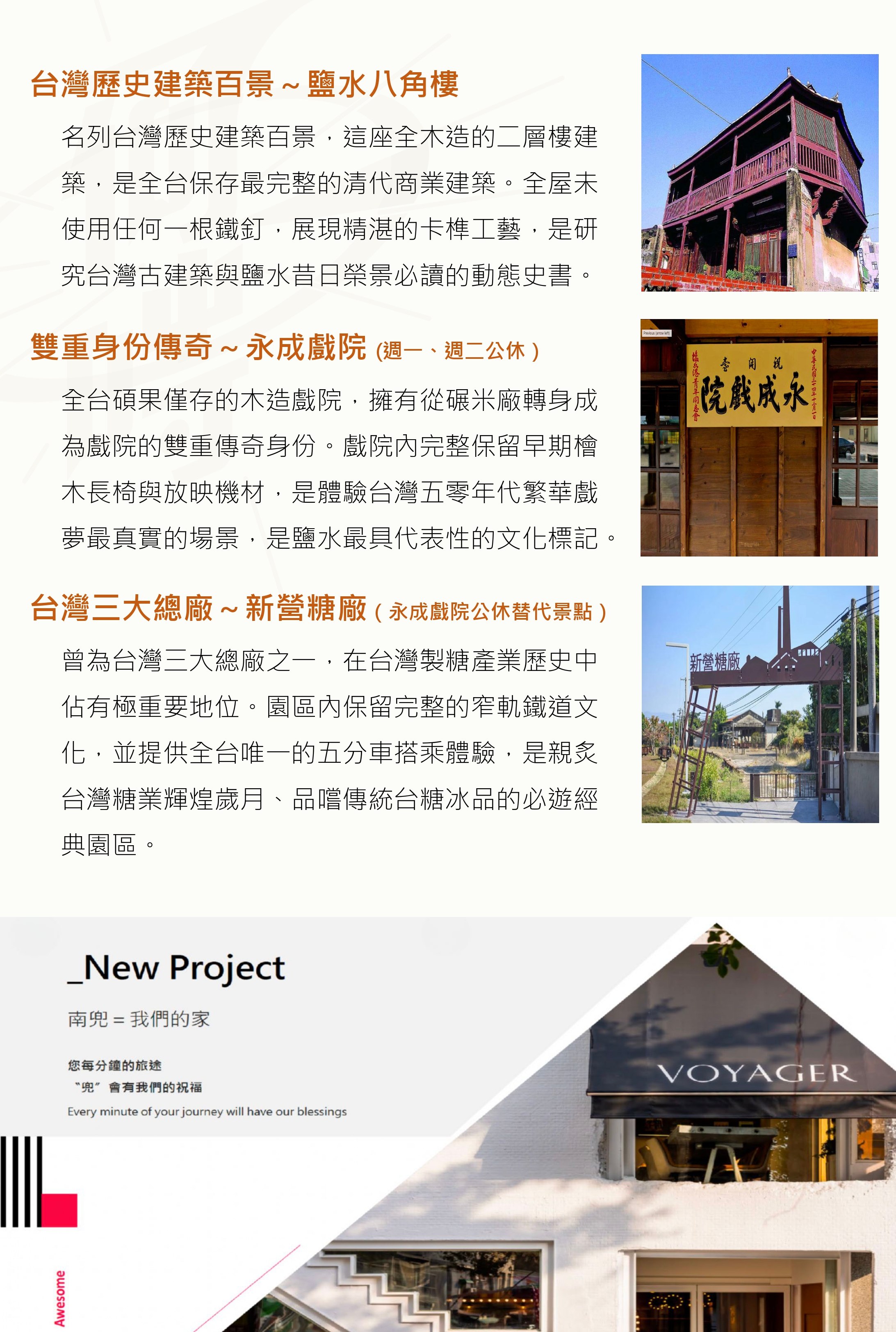走進鹽水老街轉角的【永成戲院】,彷彿推開一扇通往雙重時空的木造門扉。這座由「黃家永成碾米廠」蛻變而成的老戲院,保留了杉木桁架上殘留的稻穀香氣,又疊加了放映機轉動時膠卷的微焦氣息——兩種身份在檜木地板與磨石子階梯間溫柔並存。您可坐在復刻的藤製座椅上,仰望天井瀉下的自然光如何為木造結構鍍上金邊;觸摸牆面斑駁的電影海報殘跡,指尖彷彿能觸及《梁山伯與祝英台》放映時觀眾的淚光與笑聲;轉進後方碾米機具展示區,鐵鑄齒輪與木製斗箕仍低語著戰後糧食歲月的故事。當午後陽光斜射入窗,空氣中浮動的塵埃在光束裡起舞,恍惚間彷彿能聽見兩種回音同時響起:米粒流淌的沙沙聲與膠卷轉動的噠噠聲,在此達成跨越世紀的和解。這裡不只是一座戲院,更是一棟會呼吸的雙生建築——它用木頭的溫潤與光影的魔法,將產業史與娛樂史織成鹽水小鎮最動人的記憶錦緞。