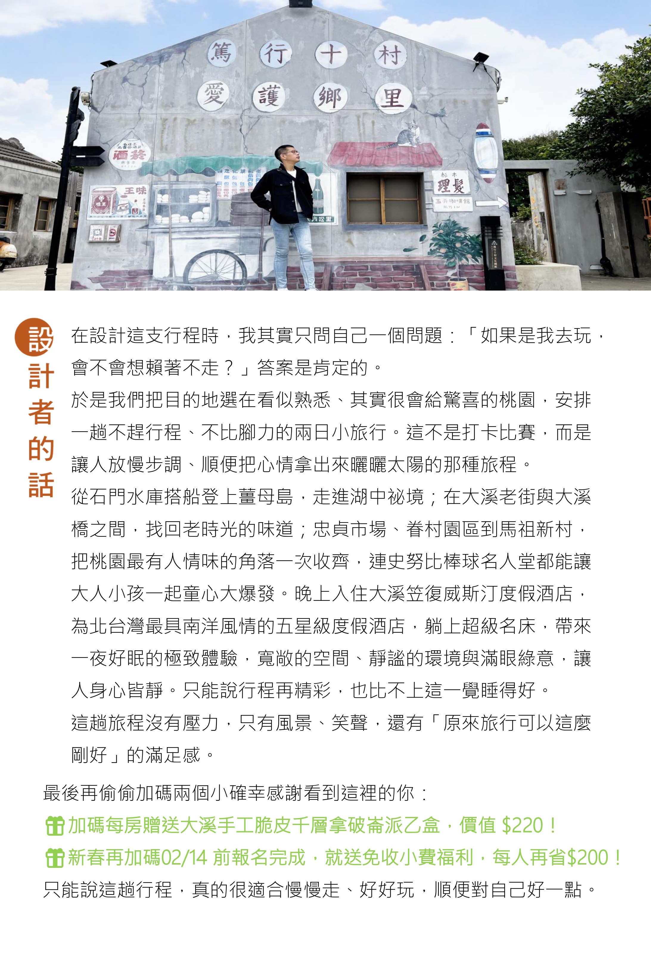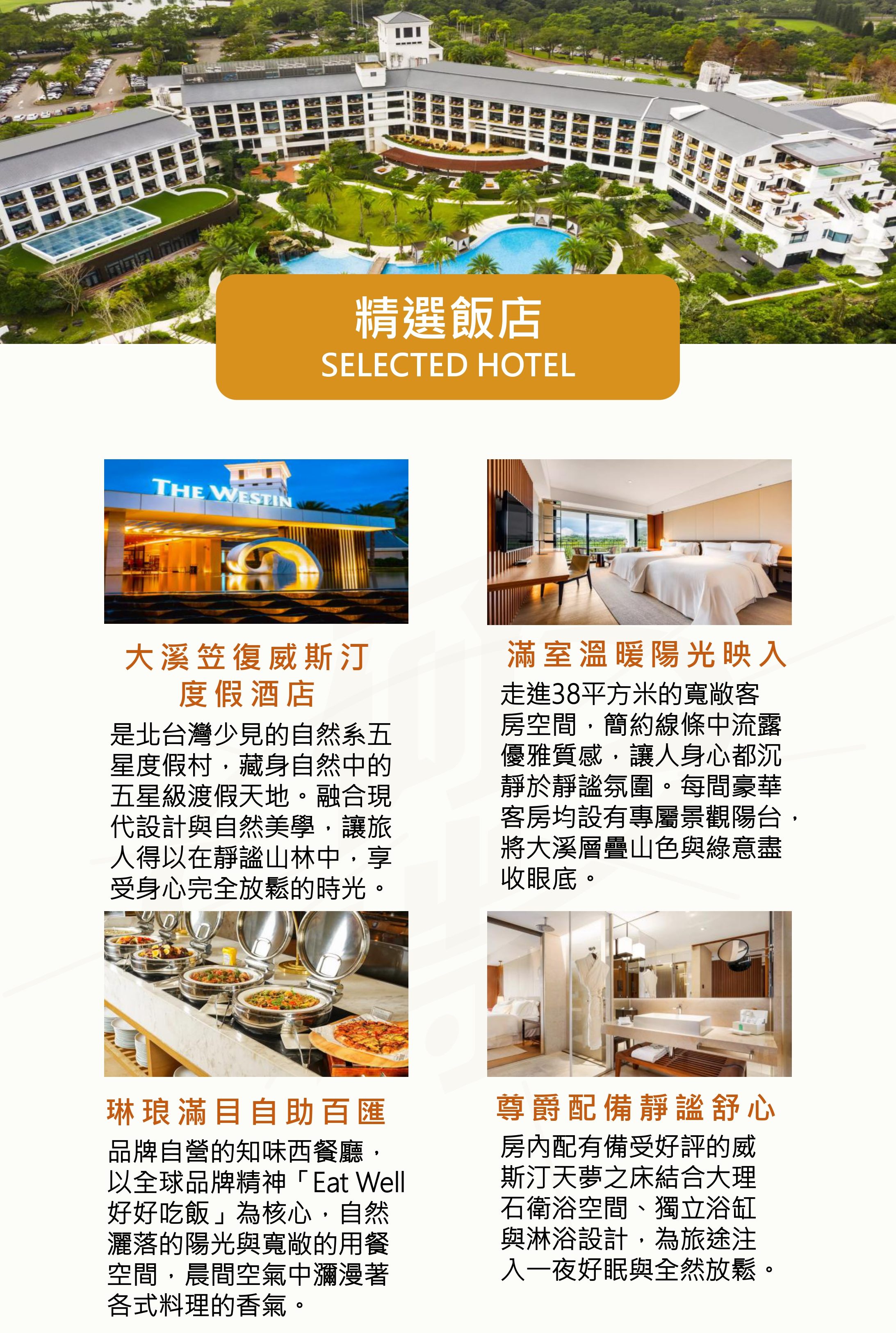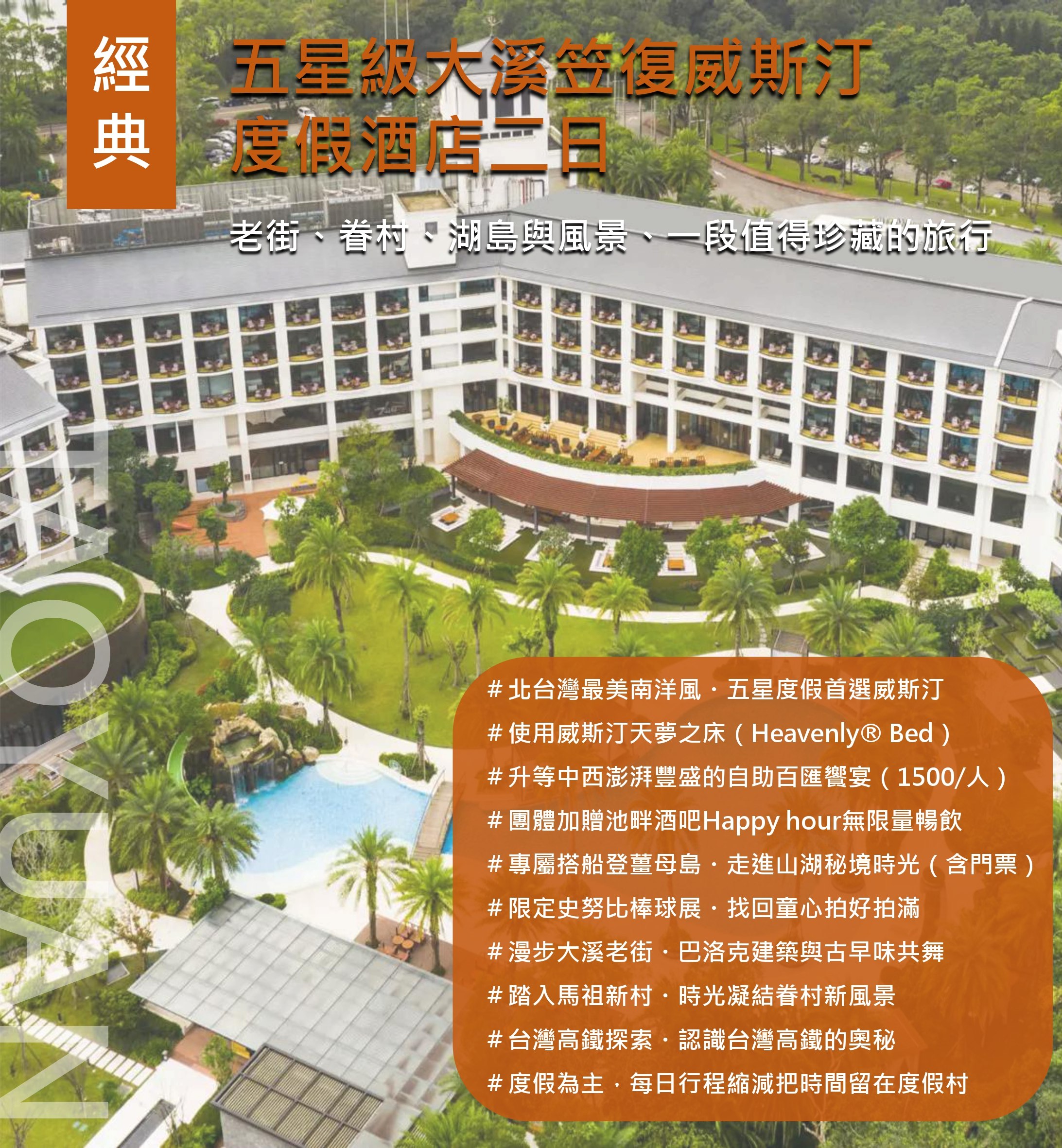 經典五星級大溪笠復威斯汀度假酒店二日|老街、眷村、湖島與風景、一段值得珍藏的旅行 32 NT$5,999 可報名