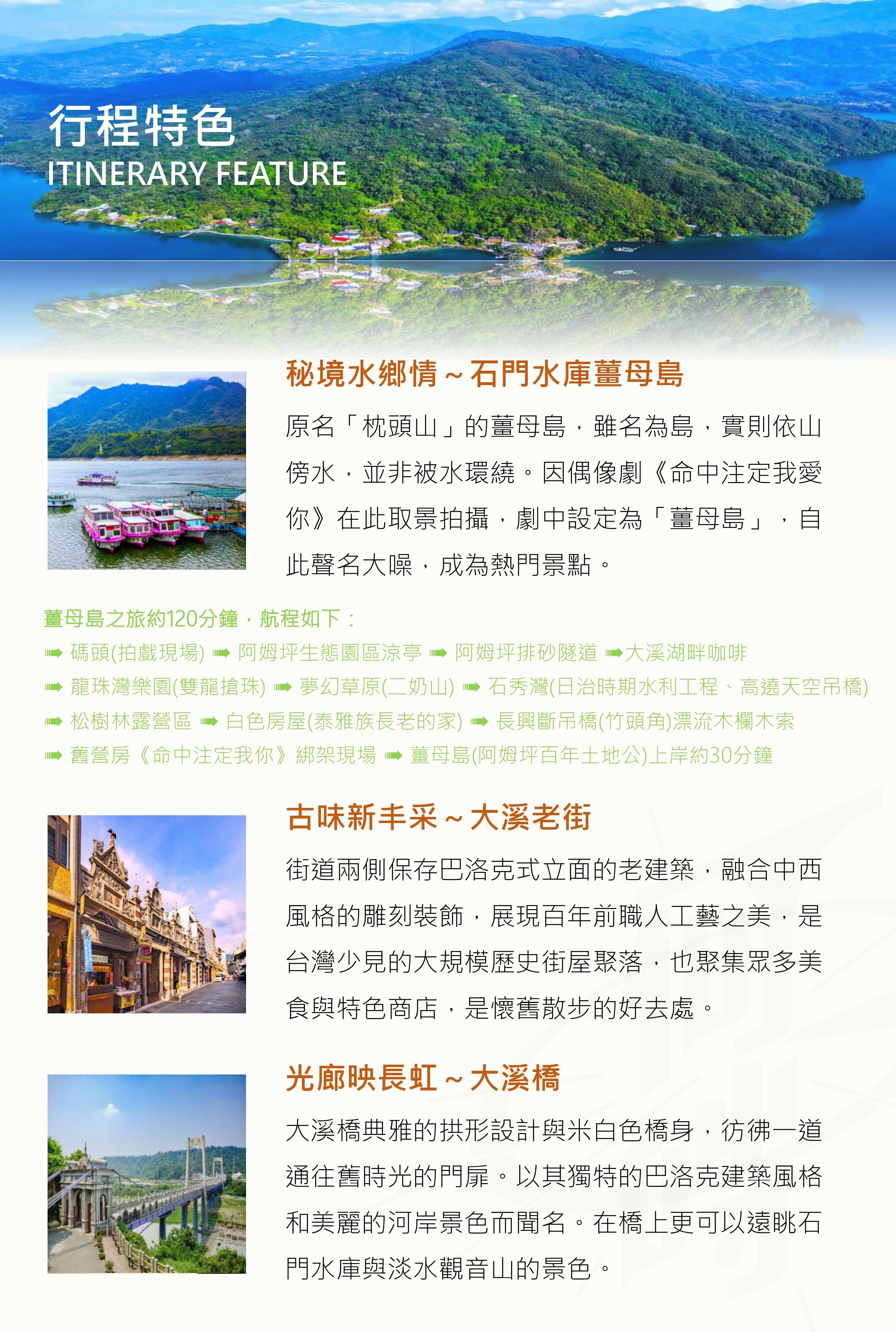 湖光山色~石門水庫薑母島(特別安排登島體驗120分鐘) 老街風情~大溪橋/大溪老街(漫步巴洛克街道,品嚐傳統小吃) 童趣時光~史努比棒球名人堂(親子同遊,限定主題打卡展) 入住桃園大溪笠復威斯汀度假酒店The Westin Tashee Resort