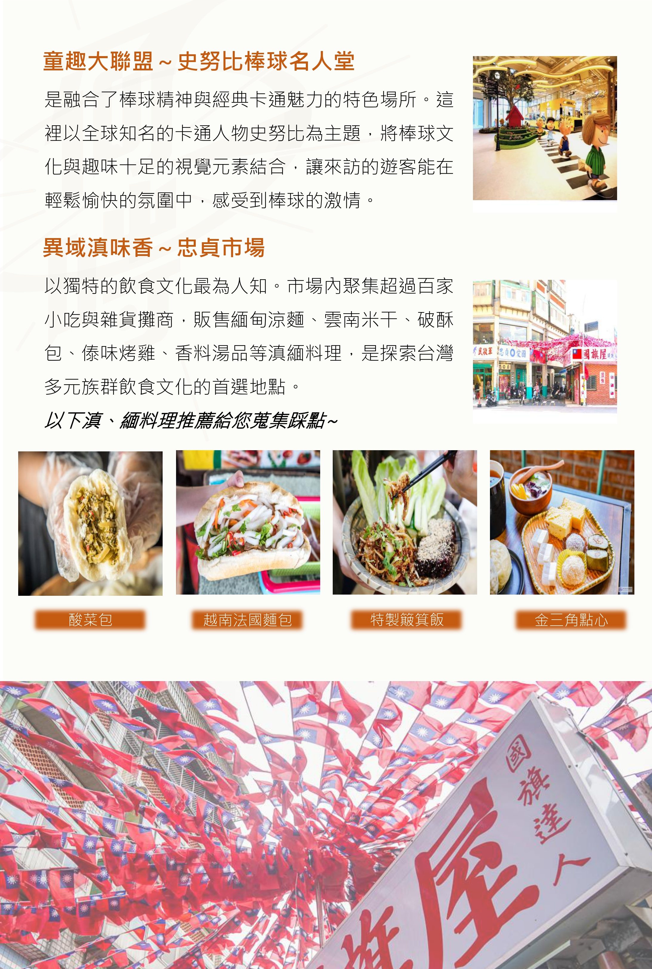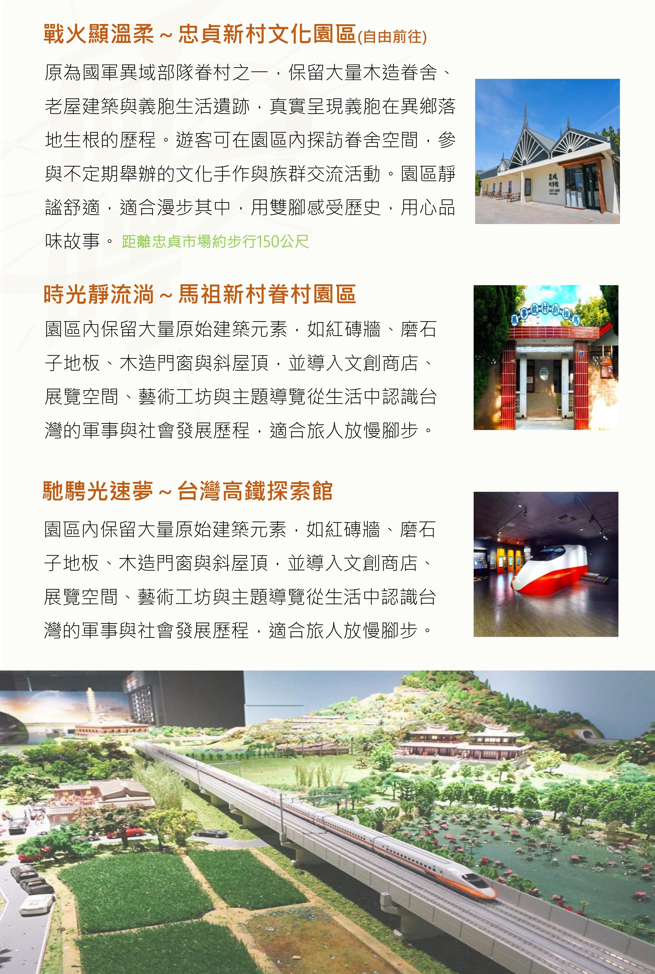 市井食趣~忠貞市場(異域風味齊聚,品嚐在地經典小吃)  可自由前往唯一融合滇、緬、泰族裔的文化聚落~忠貞新村園區 懷舊記憶~馬祖新村眷村園區(時光倒流眷村,文創與老屋交織) 科技旅程~台灣高鐵探索館(展示高鐵奧秘,寓教於樂的知識探索) *台灣高鐵探索館每日限額預約,若額滿則調整成華泰名品城。