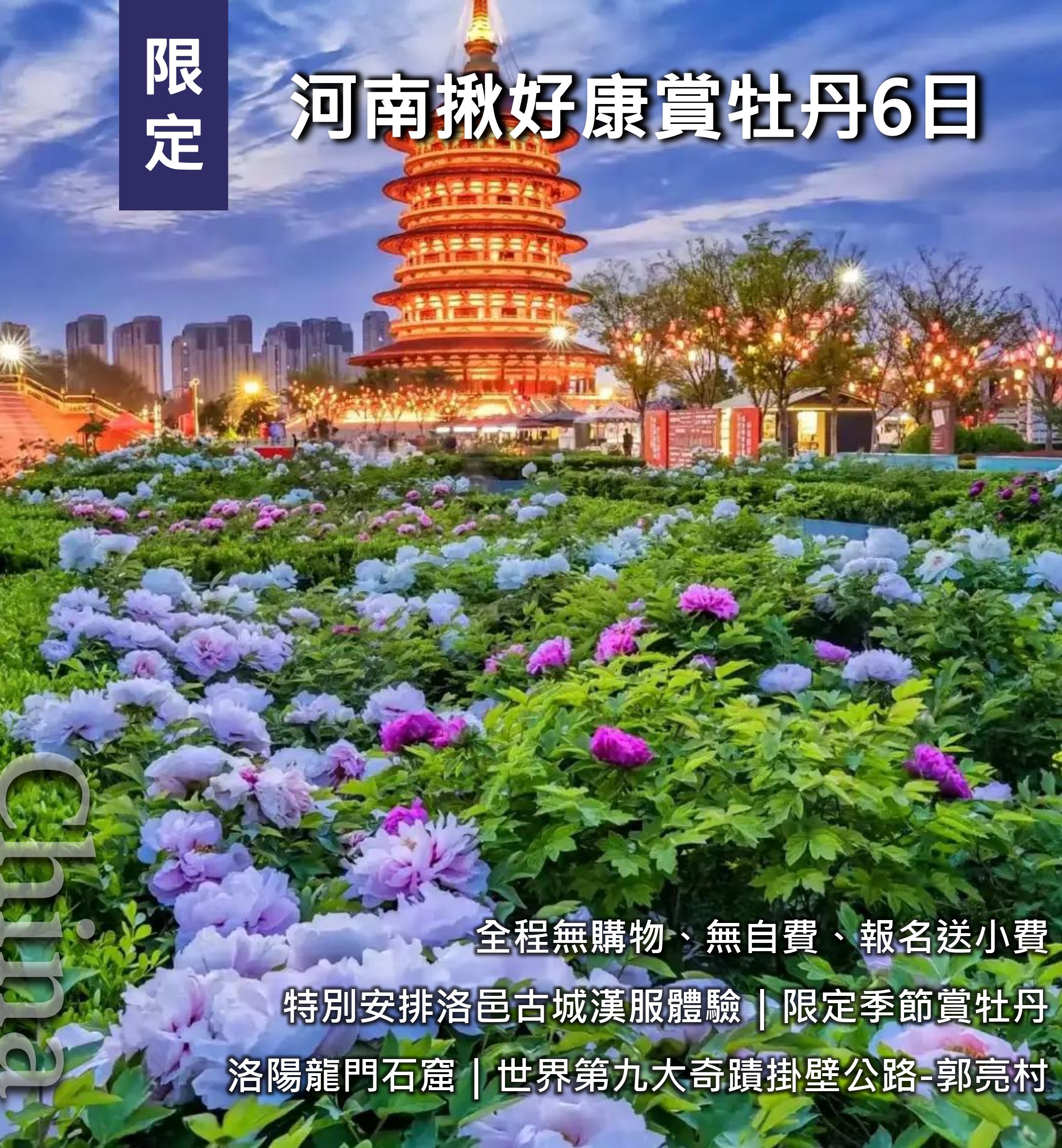 限定河南揪好康6日|牡丹園賞花、洛陽龍門石窟、世界第九大奇蹟掛壁公路、古城漢服體驗、全程無購物、無自費、報名送小費