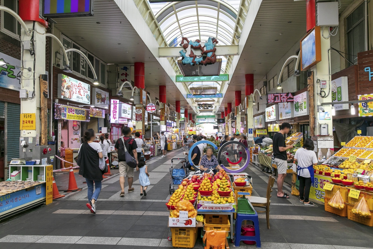 東門傳統市場位於濟州市中心,歷史悠久,自1945年開設至今,是島上最具代表性的在地市場。市場內攤位眾多,販售新鮮海產、蔬果、韓式小吃及手工藝品。遊客可品嚐烤帶魚、濟州黑豬肉、海鮮煎餅等地道美食,也能購買柑橘、蜂蜜等特產作伴手禮。夜間更設有熱鬧的夜市區,燈火通明、人潮不斷,展現濟州庶民生活風貌。這裡融合傳統與現代,既是當地居民的日常採買場,也是旅客感受在地文化的必訪之地。