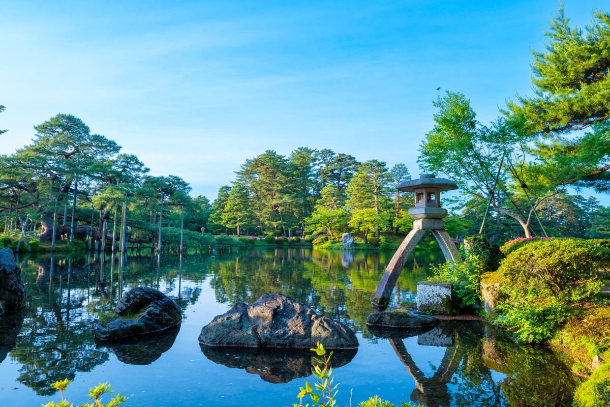 兼六園位於金澤市,是日本三大名園之一,以「宏大、幽邃、人力、蒼古、水泉、眺望」六大意境聞名。園內以池泉回遊式庭園為主軸,春有櫻花,夏賞翠綠,秋看楓紅,冬季雪吊景觀更是象徵庭園極致之美。園中必訪景點包含徽軫燈籠、霞之池、唐崎松等,皆展現細膩的庭園美學。