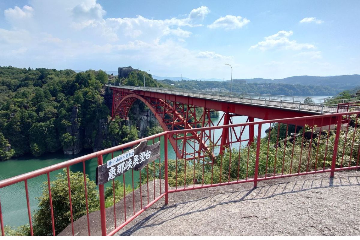 惠那峽由木曾川長年侵蝕而成,形成奇岩怪石並伴隨碧綠湖面,呈現雄偉自然景觀。展望台視野遼闊,可俯瞰峽谷蜿蜒、湖光山色交織的畫面,夕陽時更顯金光流動。春天的櫻、秋天的楓讓景色更加豐富,是攝影愛好者與自然旅人的絕佳勝地。展望台旁亦設有輕鬆散策步道,可細細觀賞峽谷切割出的壯觀地形,是感受飛驒與木曾自然風貌的絕佳景點。