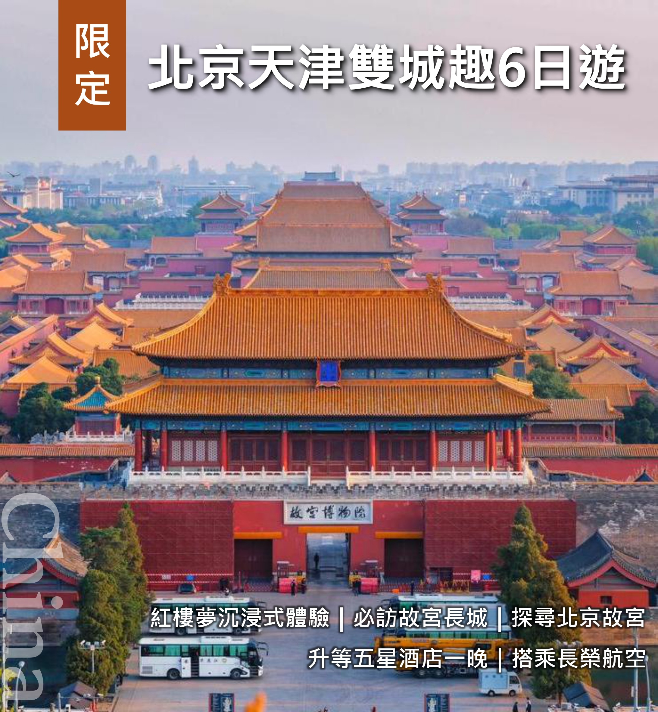 特選北京天津雙城趣6日|必訪故宮長城、升等五星酒店一晚、搭乘長榮航空、只有紅樓夢沉浸式體驗、無購物、無自費、無自理餐