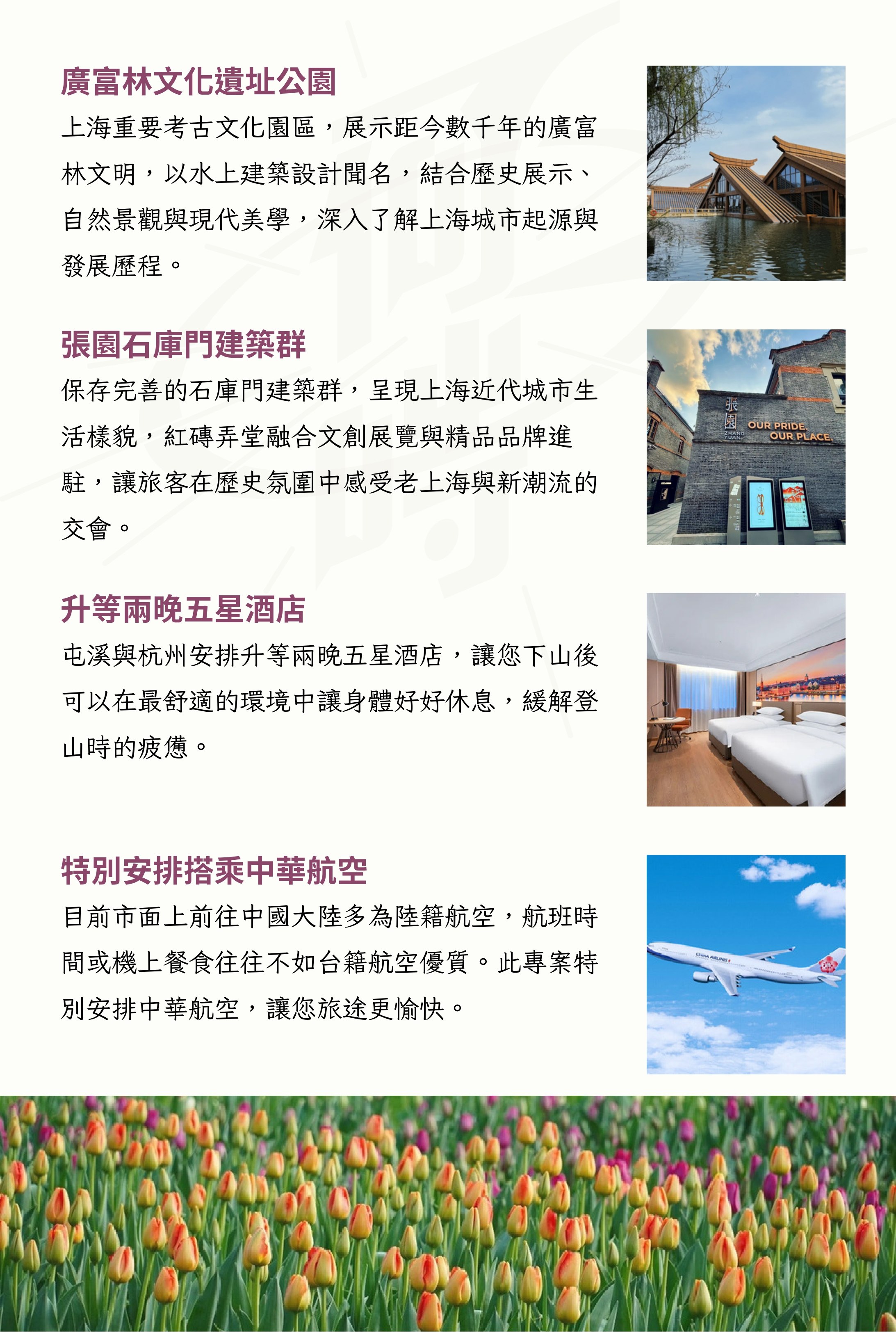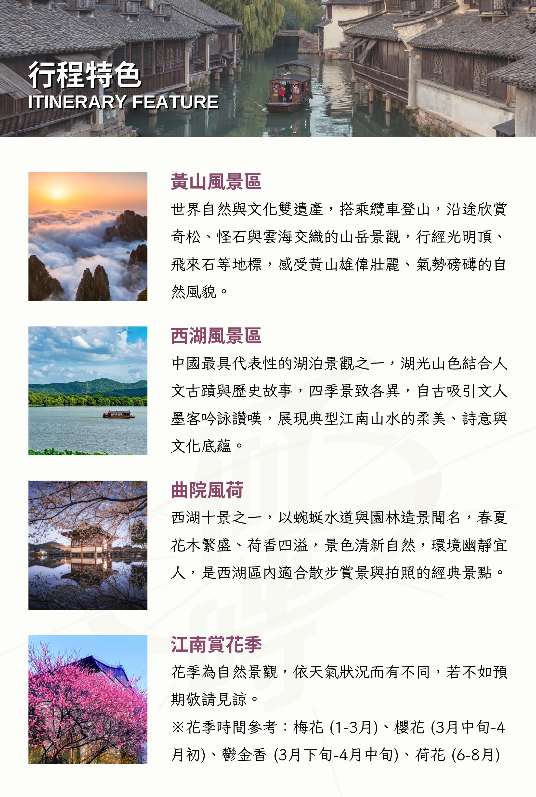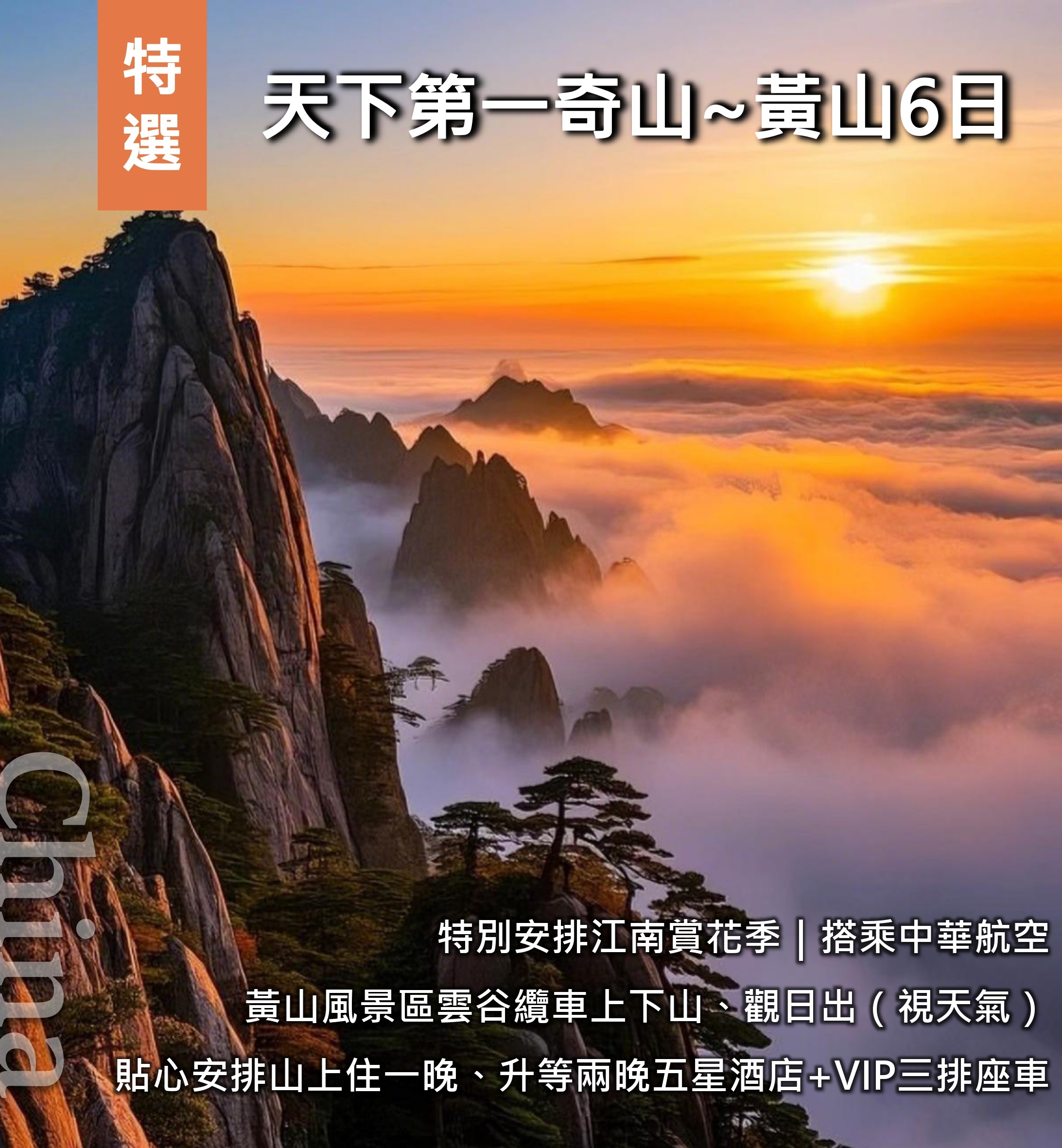 特選天下第一奇山~黃山6日|山上住一晚、升等兩晚五星酒店+VIP三排座車、江南賞花季、特別安排搭乘中華航空