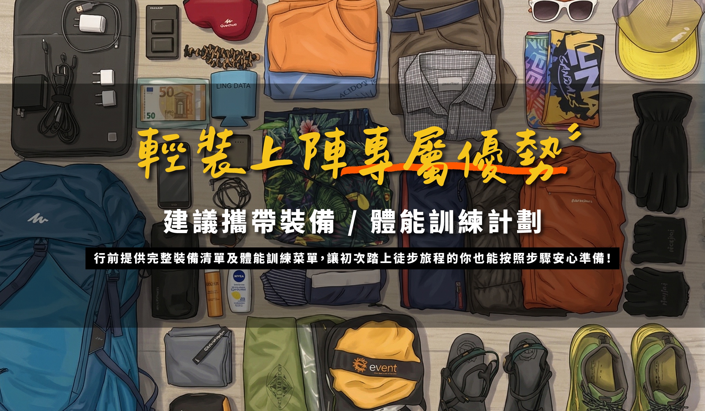 核心原則是:只帶沿途無法補購的東西。衣服三套輪換就夠(排汗材質,快乾),羊毛襪比棉襪耐穿且不臭,徒步鞋出發前至少穿過一個月。護膚品、急救小包、充電器——買旅行裝或分裝,不要帶整罐。出發前我們會辦裝備說明會,逐項檢視哪些帶、哪些不用帶。過去最常見的狀況是:每天都在丟東西。