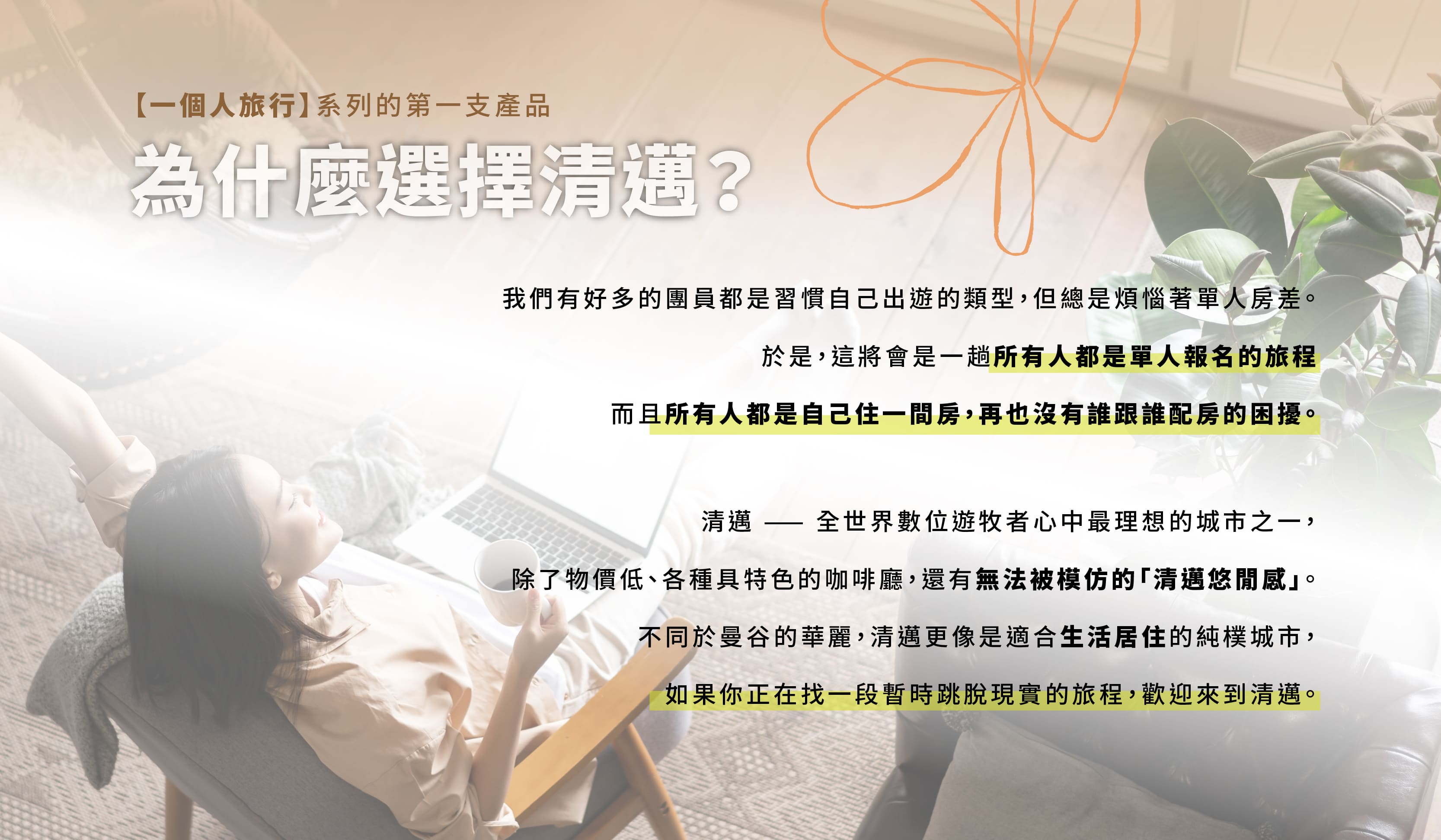 2026/12/24(四) | 無包含航班出發 【一人旅行】我在清邁有個家5日x單人出發|一人一房住進風格民宿、漫步素帖山秘境、蘭納古城文化、森林藝術村散策(不含機票)機位 10 候補0 已售2 可售4 |
