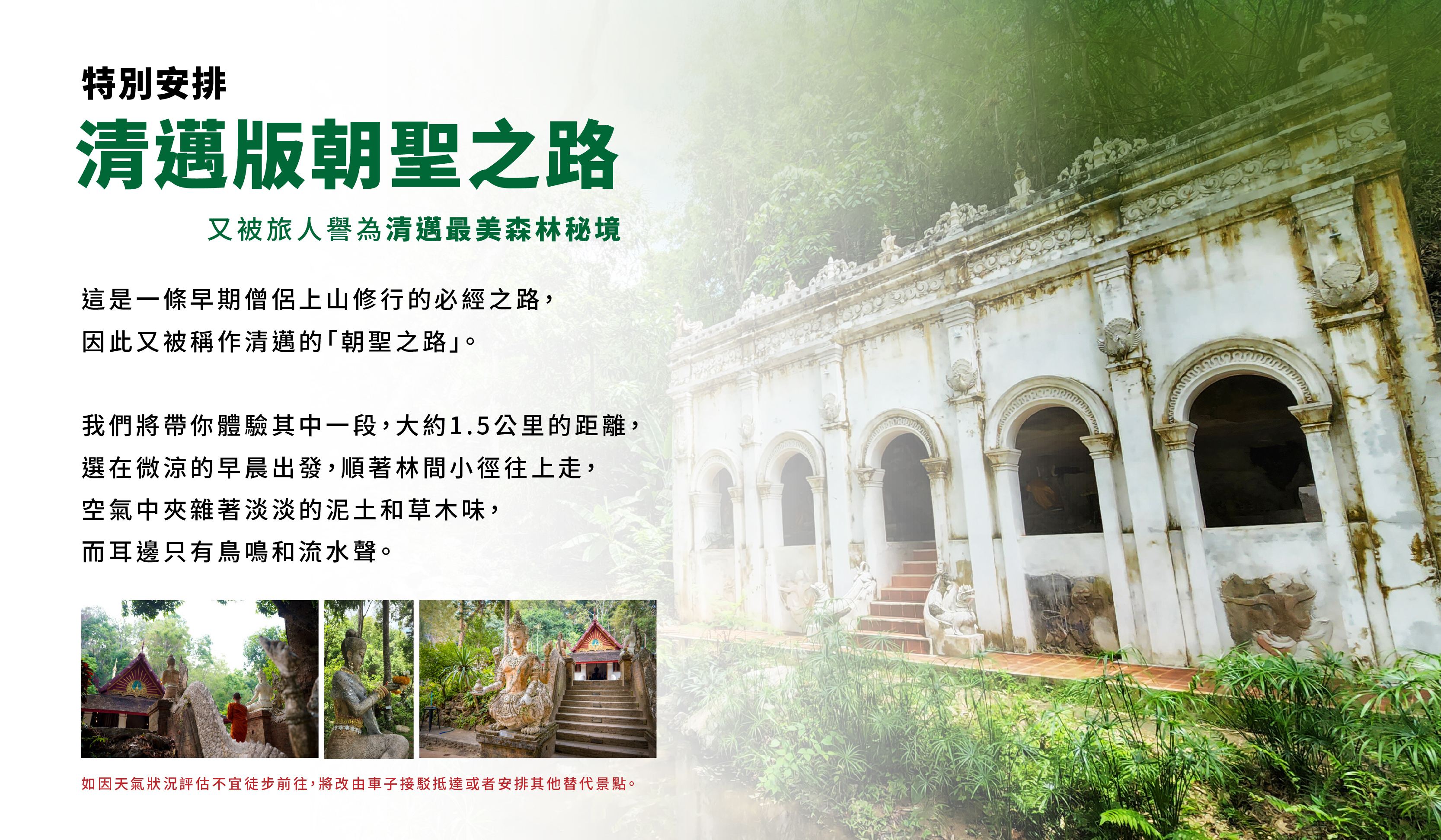 這是一條歷史悠久的古老步道,曾是僧侶登向山頂寺廟的修行之路,目前是清邁最受歡迎的健行與心靈洗禮路線之一,輕裝上陣團隊將帶你體驗其中一段約 2 公里的路段,走進森林內感受素帖山下的平靜,接著找到隱藏在瀑布與森林間、被譽為清邁最美的森林寺廟。(※如因天氣狀況不利於健行,我們將會直接搭車前往森林寺廟參訪。)
