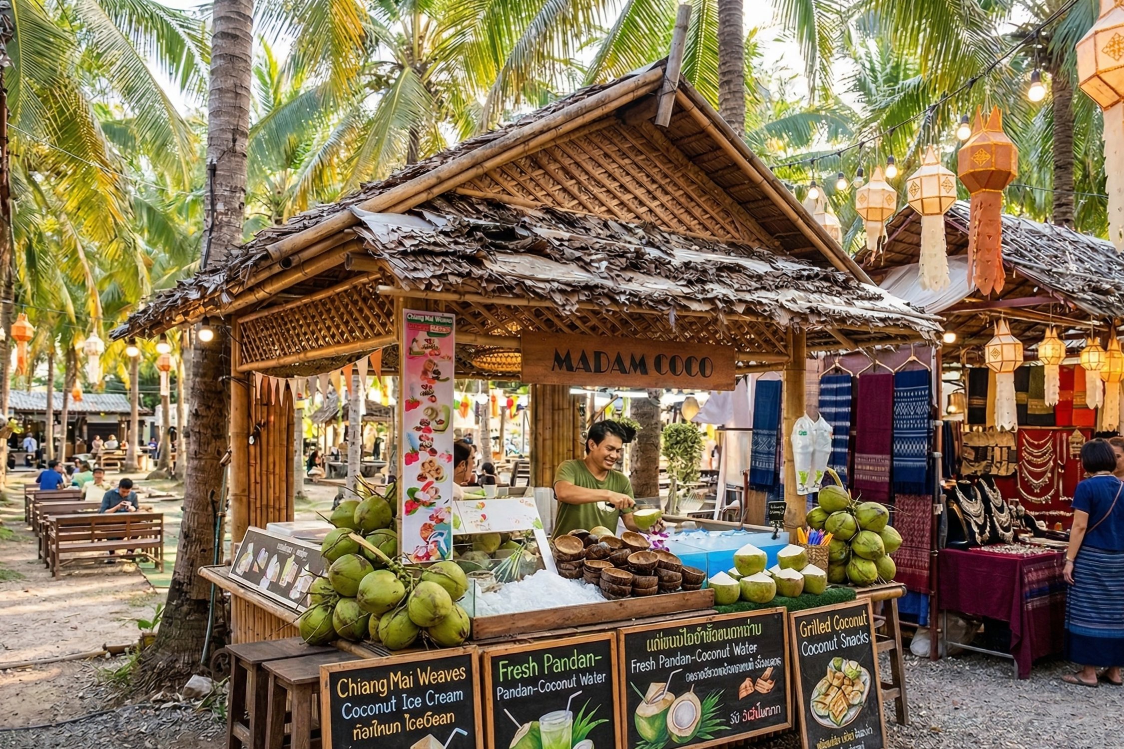 椰林市集又稱為「Kad Ba Pao」,是一個在椰子園內的週末熱門市集,以自然生態與文青風為主。椰林市集最著名的便是坐在椰林樹間的涼亭中休息、拍照,園區內更有餵食小羊等親子互動體驗,輕裝上陣強力推薦,雖然相比真心市集的規模雖然略小,但攤販的豐富度不相上下!(※市集僅於週六、日開放,如遇平日將安排其他替代景點。)