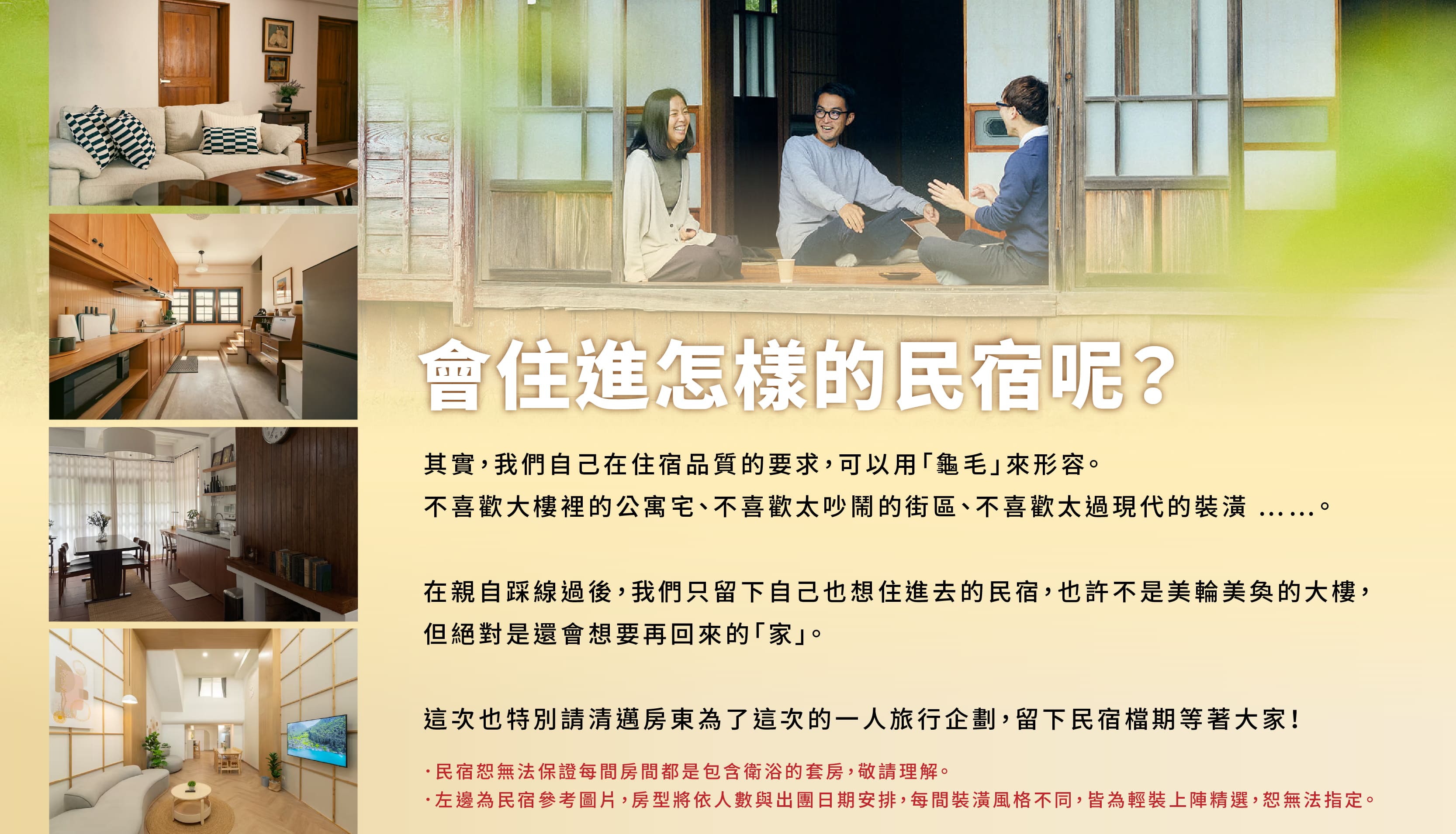每一趟旅程都住飯店,難免會有些遺憾與冷漠。在民宿裡,有客廳、有餐桌、有公共空間,當行程結束後回到民宿,你可以選擇和同行旅人聊天、分享宵夜,也可以選擇只是回到自己的房間裡休息。因為大家都是一個人,所以沒有非要社交不可的群眾壓力。