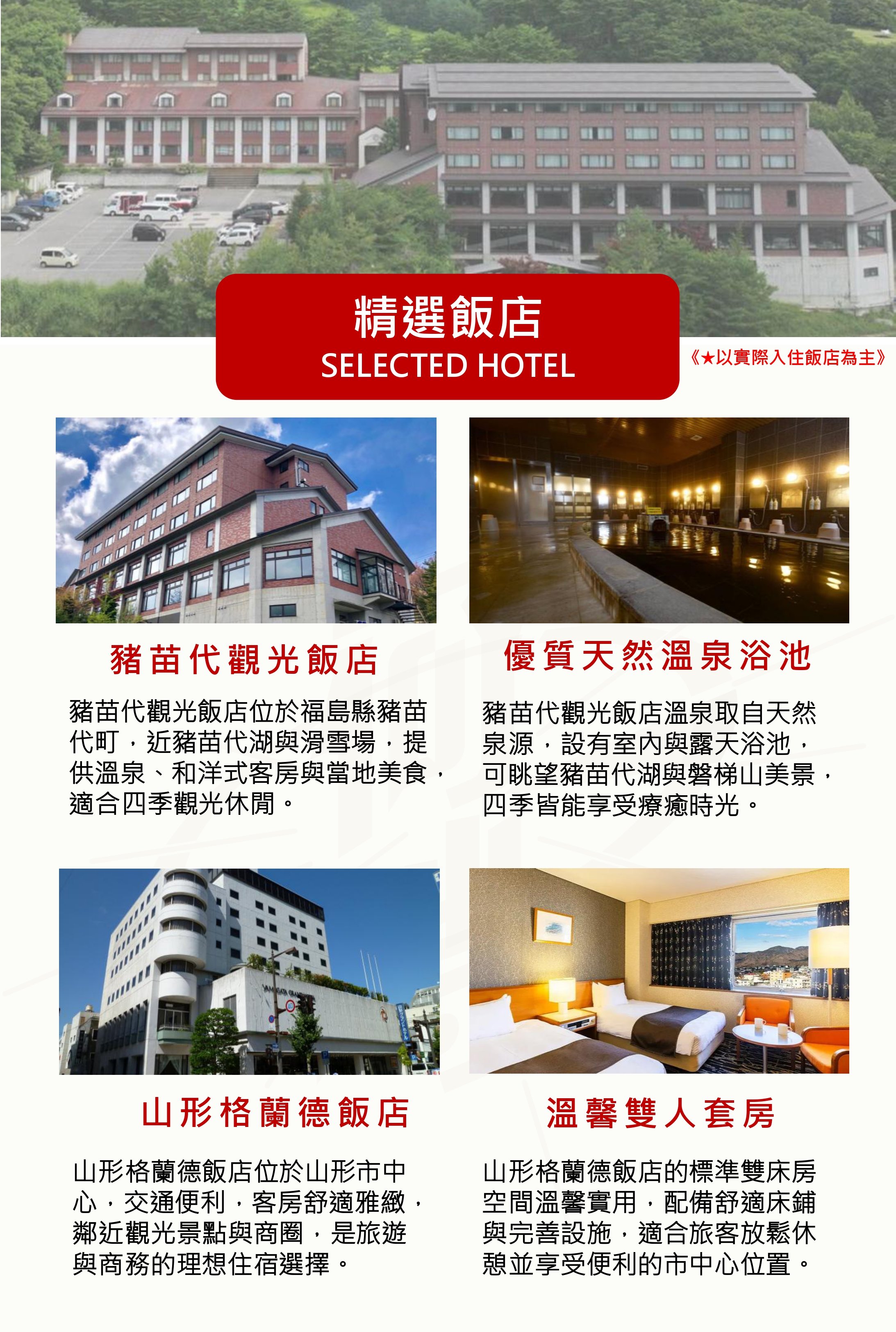 住宿:山形格蘭德飯店 或Route Inn飯店 或天童溫泉黑田景觀飯店 或 同級旅館