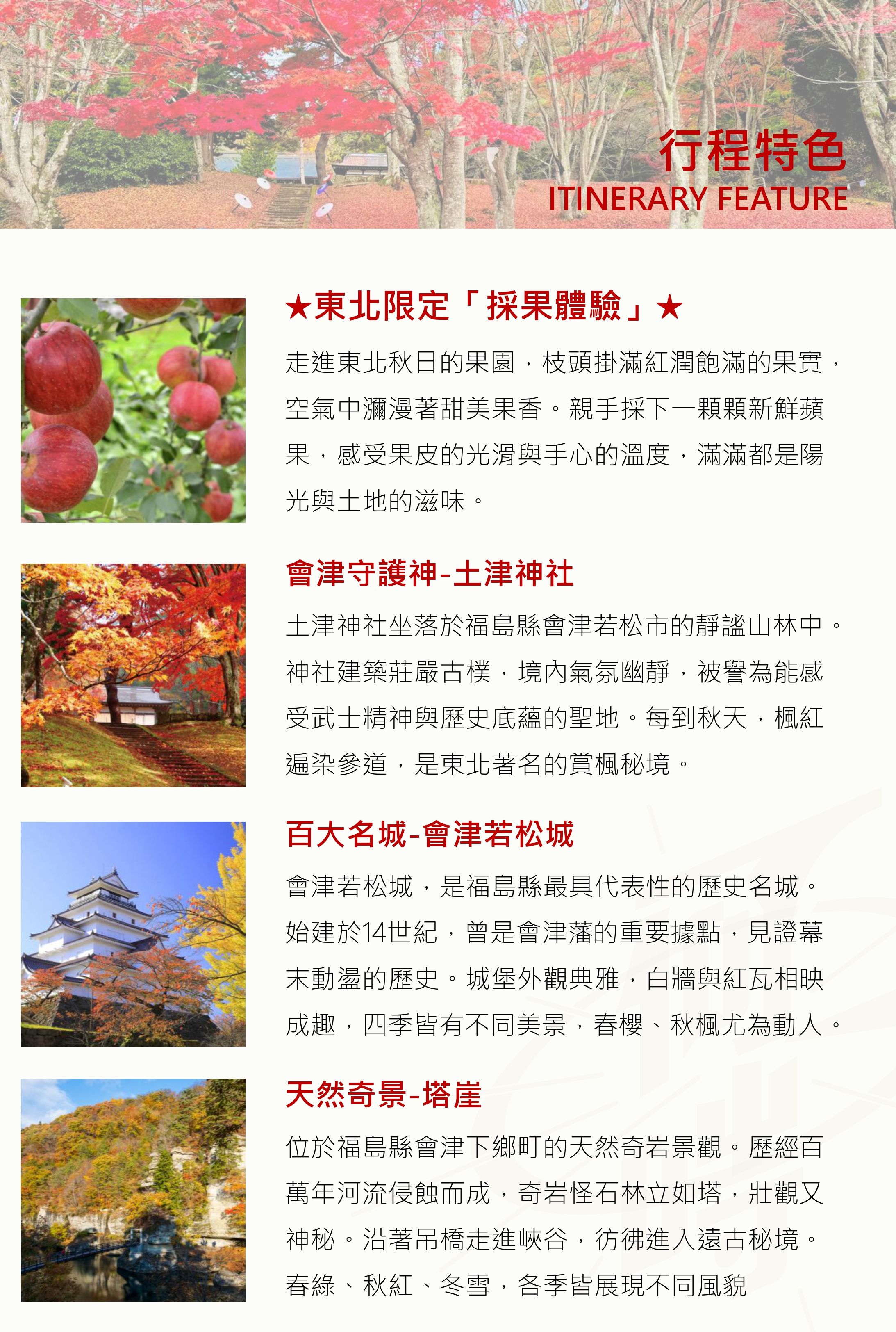 整裝行李搭乘專車前往福島機場,途中您可再一次的回想在日本所看到的景觀及畫面,抵達機場後搭乘豪華客機返回台灣,結束這次豐富的東北賞楓之旅。