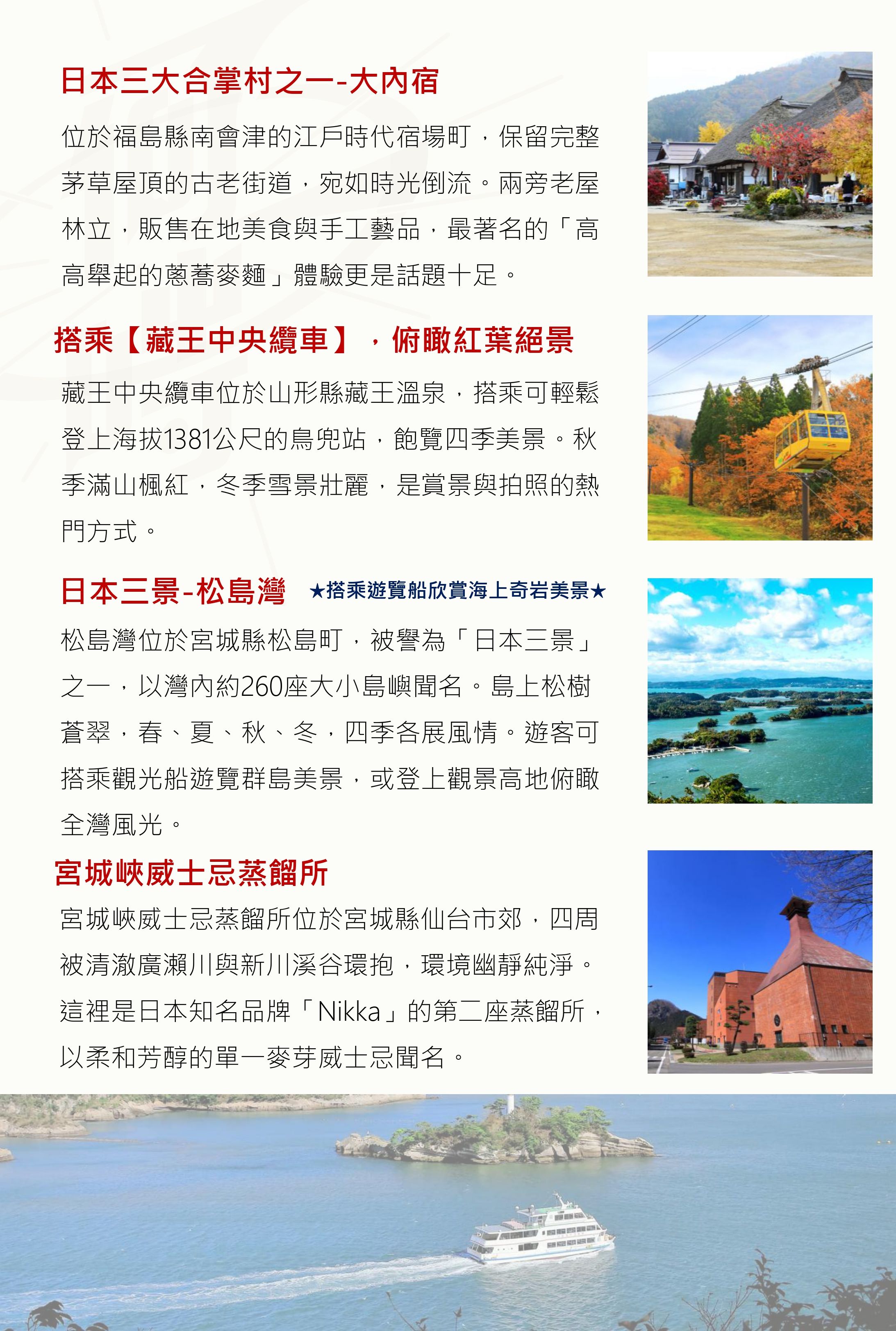 Q6:松島灣遊船會不會很無聊?值得嗎?A: 松島名列「日本三景」,絕對值得!坐在船上,看著兩百多座造型奇特的松樹島嶼在藍海中散開,那種震撼是岸邊看不了的。我們還特別安排參觀「五大堂」,感受千年古蹟的靈氣。