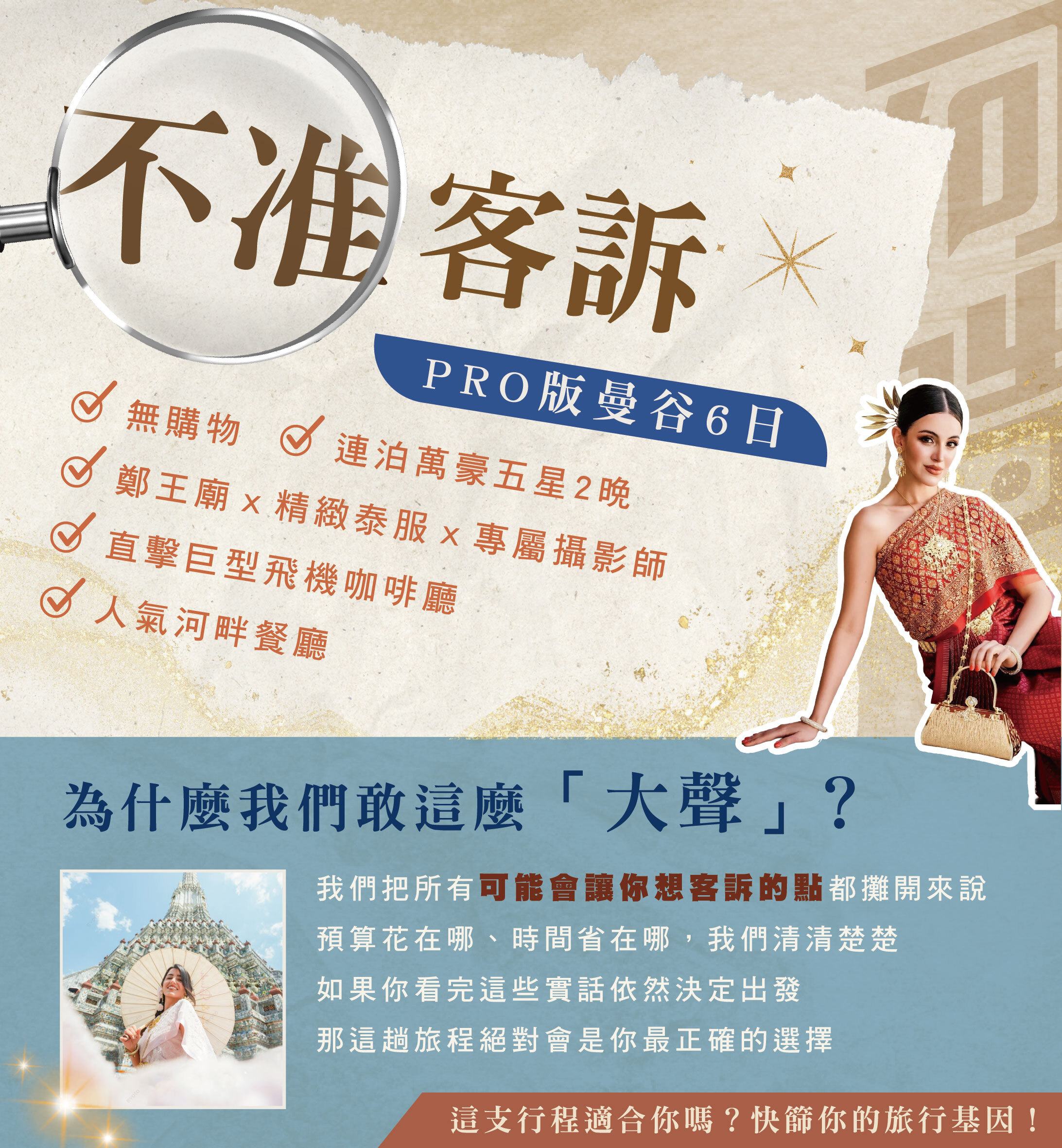 取名「不准客訴」,是因為我們比您更挑剔。我們把預算砸在連泊五星萬豪、精緻泰服X