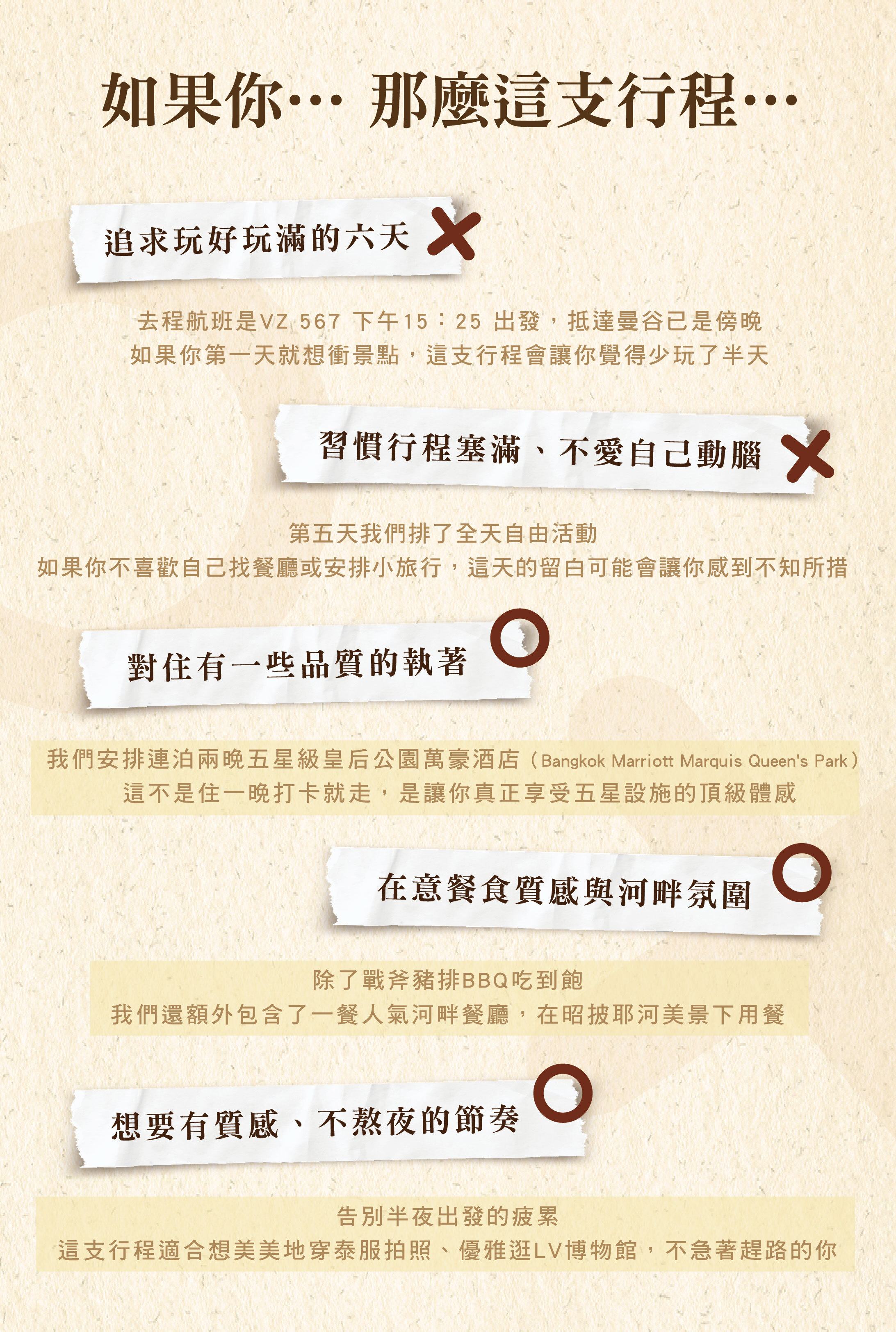 這正是我們最靈魂的設計!讓您在「團體的便利」中,擁有「自由行的浪漫」。我們深知來到曼谷,每個人心中都有想去的私藏小店或百貨。因此,我們特別在連泊五星萬豪期間,留下一整天不排行程的時間: