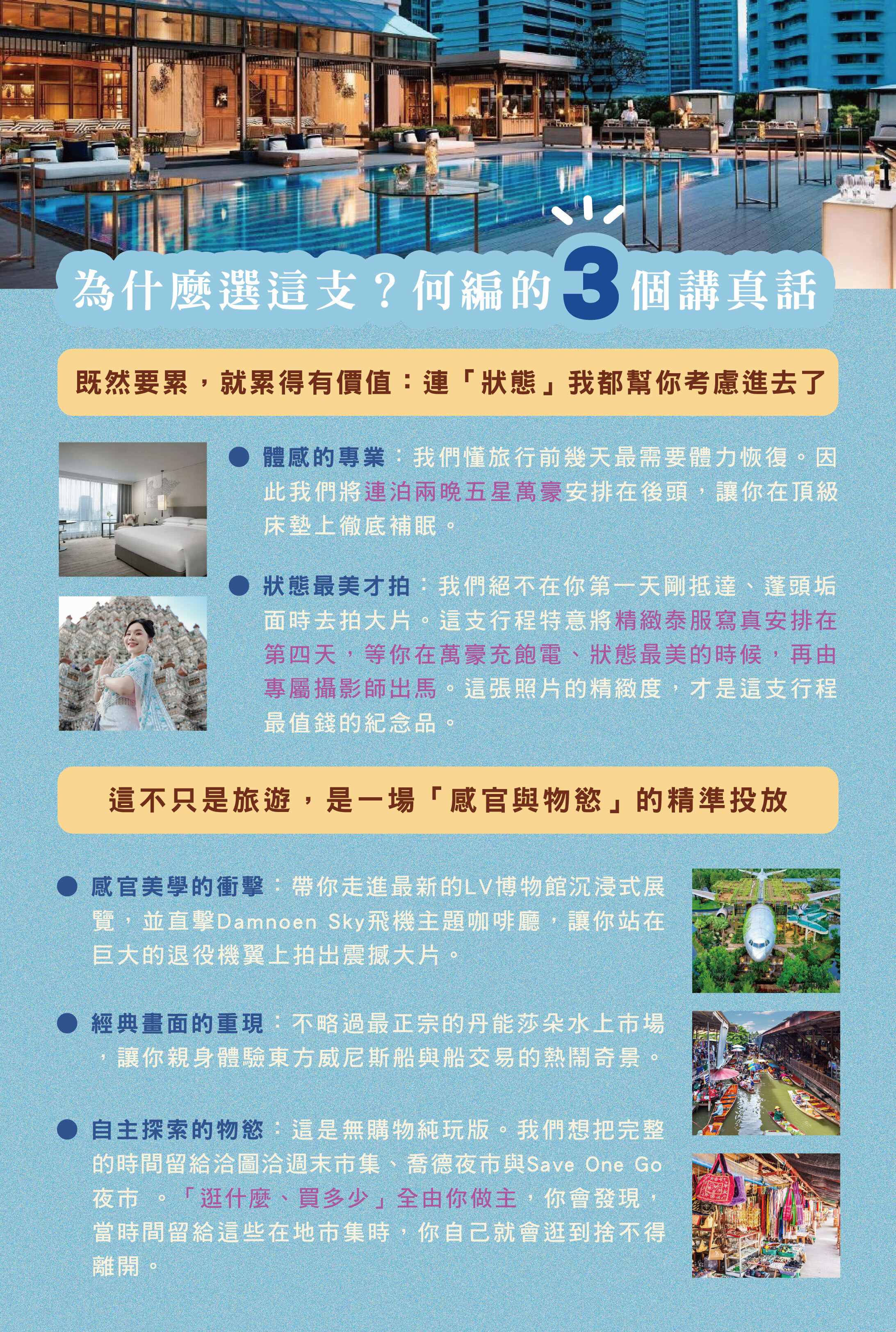 A: 錯了!曼谷的靈魂,就藏在百貨與夜市的煙火氣裡。 從潮流指標喬德夜市、在地人最愛的Save One GO夜市,到全球最大洽圖洽周末市集,這裡有最道地的米其林小吃與手作創意。我們不把您關在無聊的收費景點,是為了讓您自由探索最真實的曼谷生活。這是一場「自主權」的歸還,讓您在這些最夯地標中,找到屬於您的曼谷記憶。