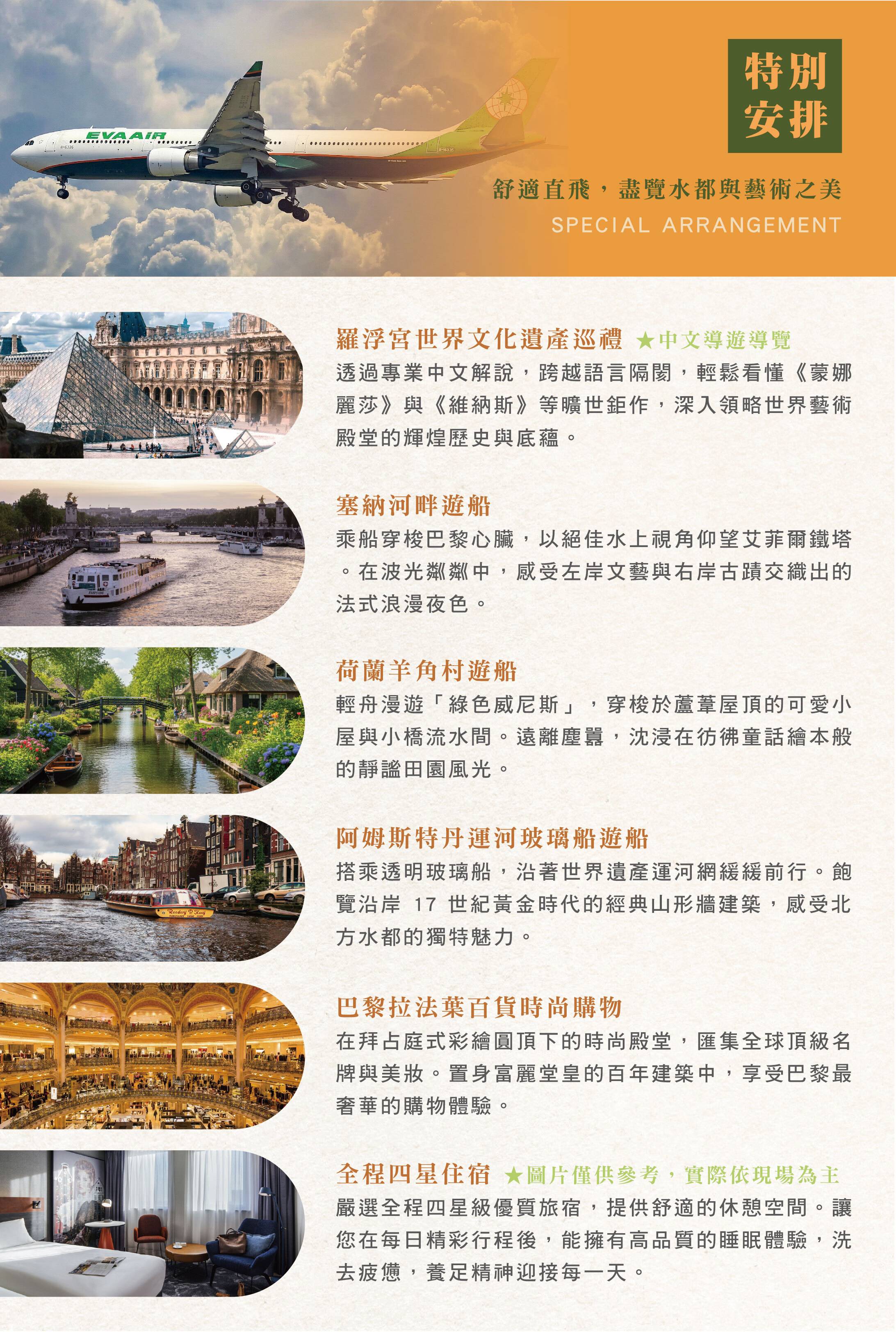 特別安排長榮航空波音777旗艦客機直飛巴黎,讓您省去轉機的奔波與等待。機艙寬敞舒適,配備個人娛樂系統與符合人體工學座椅,全中文服務、觀賞最新電影、熱騰騰家鄉味餐點,讓長途飛行成為一種享受。晚班機出發、一早抵達的絕佳時刻,讓您精神飽滿地展開浪漫的歐洲之旅。