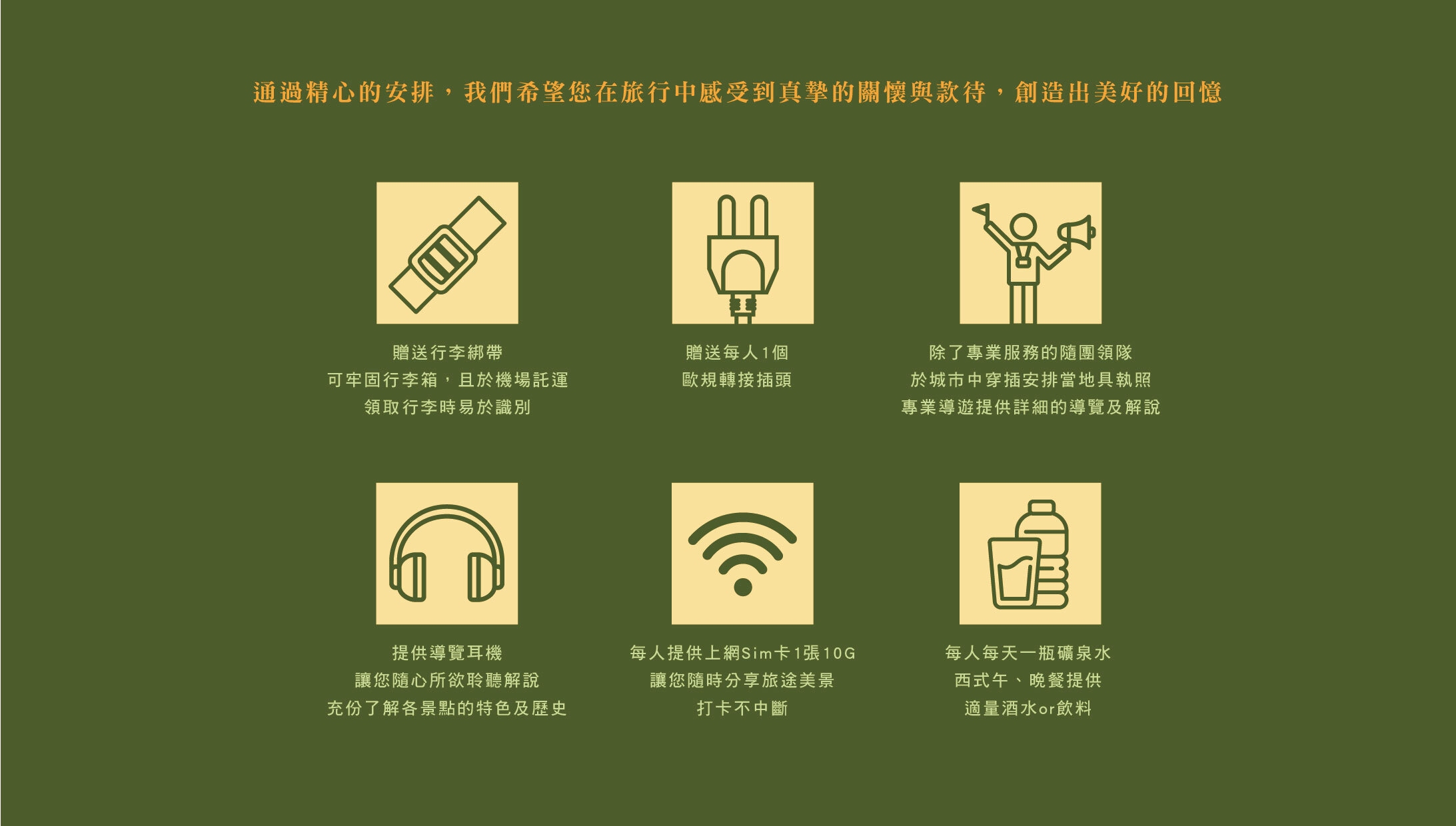 10、各家飯店對盥洗用品、吹風機、WIFI、熱水壺等設備提供的服務不盡相同,建議旅客攜帶習慣使用的個人衛浴用品與電器,或可於最終說明會時向您的業務或領隊確認。