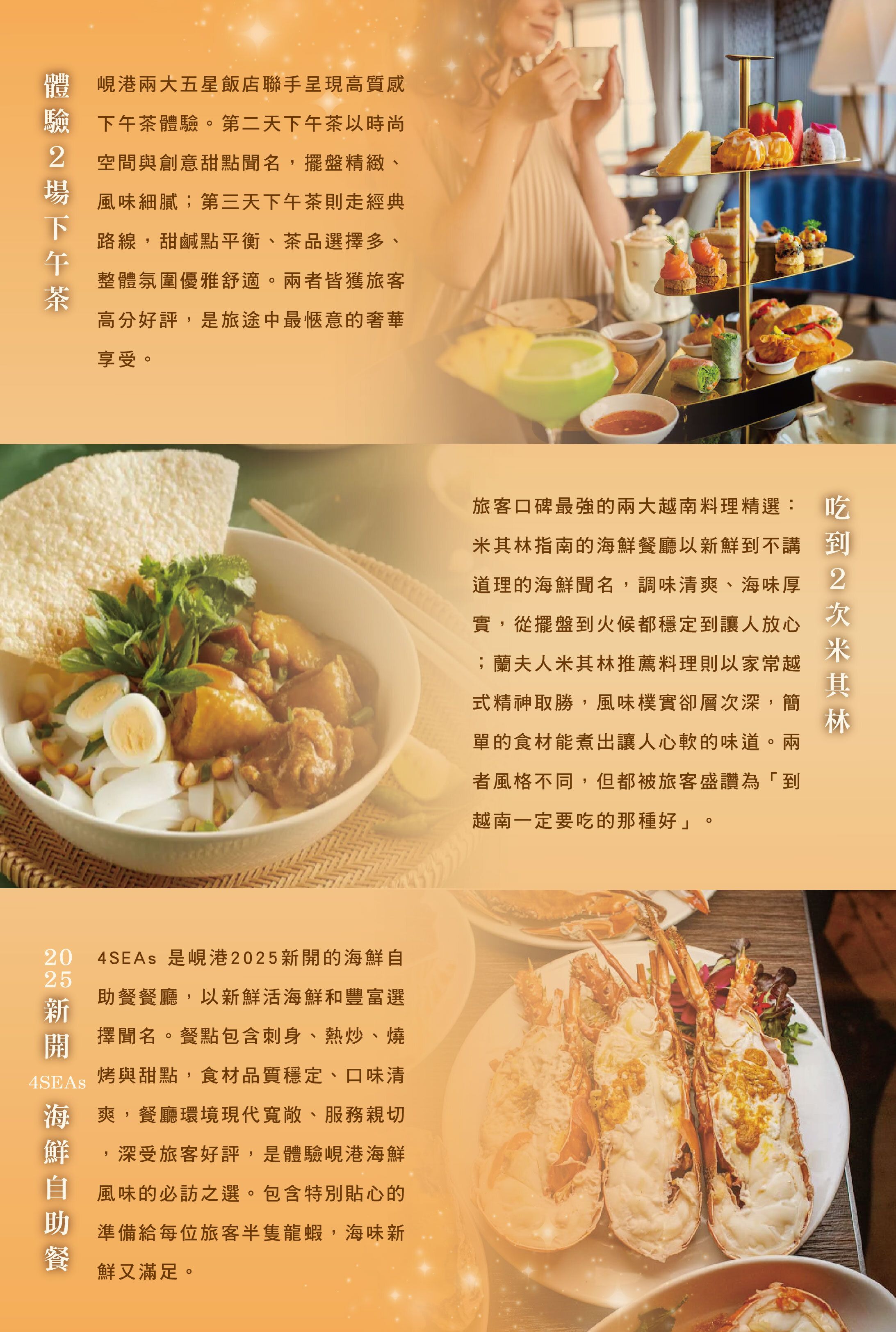 在 五星級午茶體驗 中,陽光透過落地窗灑進優雅空間,精緻茶點、手工甜品與香氣四溢的茶飲交織成午後的微醺時光。輕啜一口茶,細品甜點,感受時間在舌尖慢慢流淌,讓忙碌的旅程暫時停格,享受屬於你的片刻奢華與悠閒。