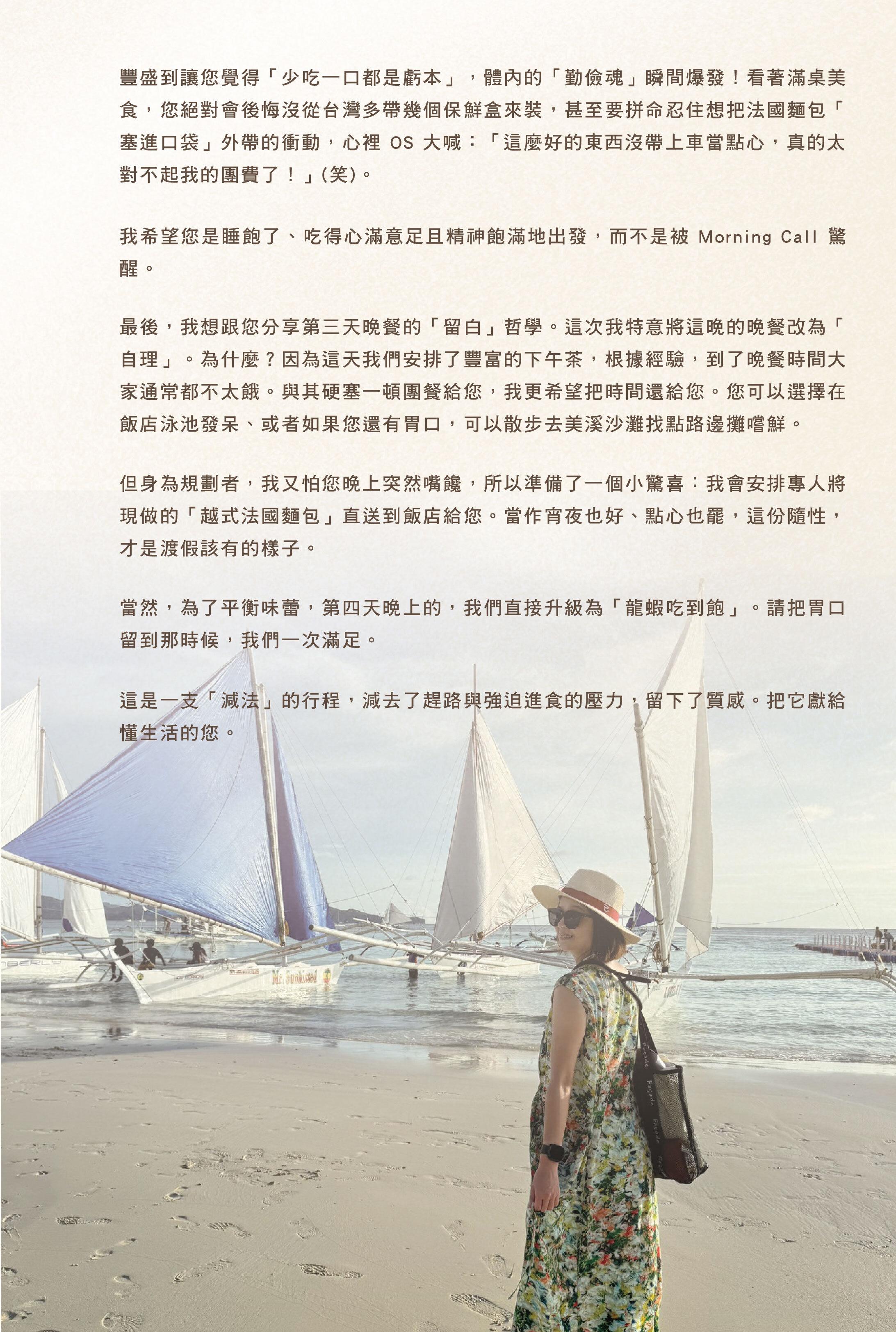 9、行程費用已包含行程中安排的景點、水上活動、住宿及餐食。如自行放棄,無法辦理退費或轉讓他人使用。安全操作細節與相關說明,將由領隊或導遊於當地再行講解,請務必配合遵守。