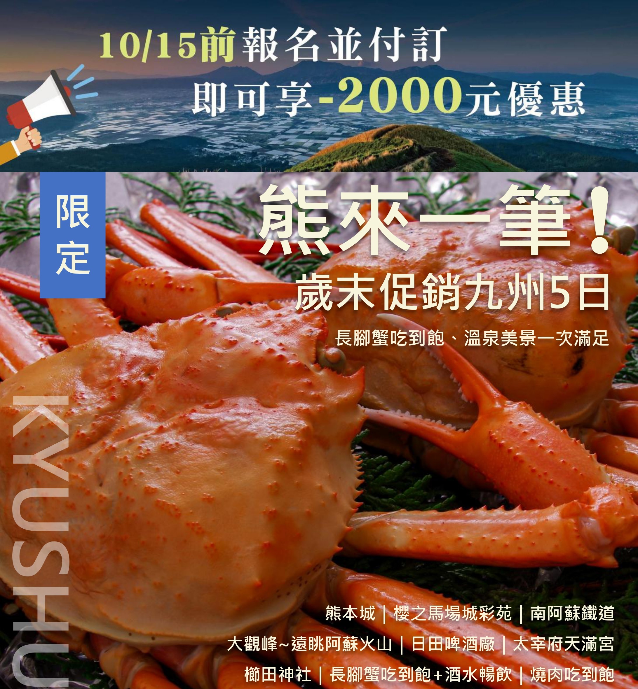 限定熊來一筆!歲末促銷九州5日|長腳蟹吃到飽、溫泉美景一次滿足。 |