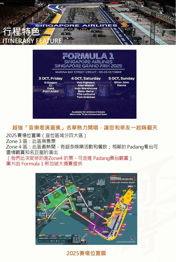 在迎接 F1 大獎賽正式開跑前,特別安排一日深度參訪行程,帶旅客從不同角度認識新加坡的城市底蘊。當天將走進金融核心區或尖端都市規劃機構,由專人引導解說,了解新加坡如何以精準政策、創新思維與高效運作,在極小的國土條件下打造全球競爭力,將「有限」轉化為「無限」的發展可能。。