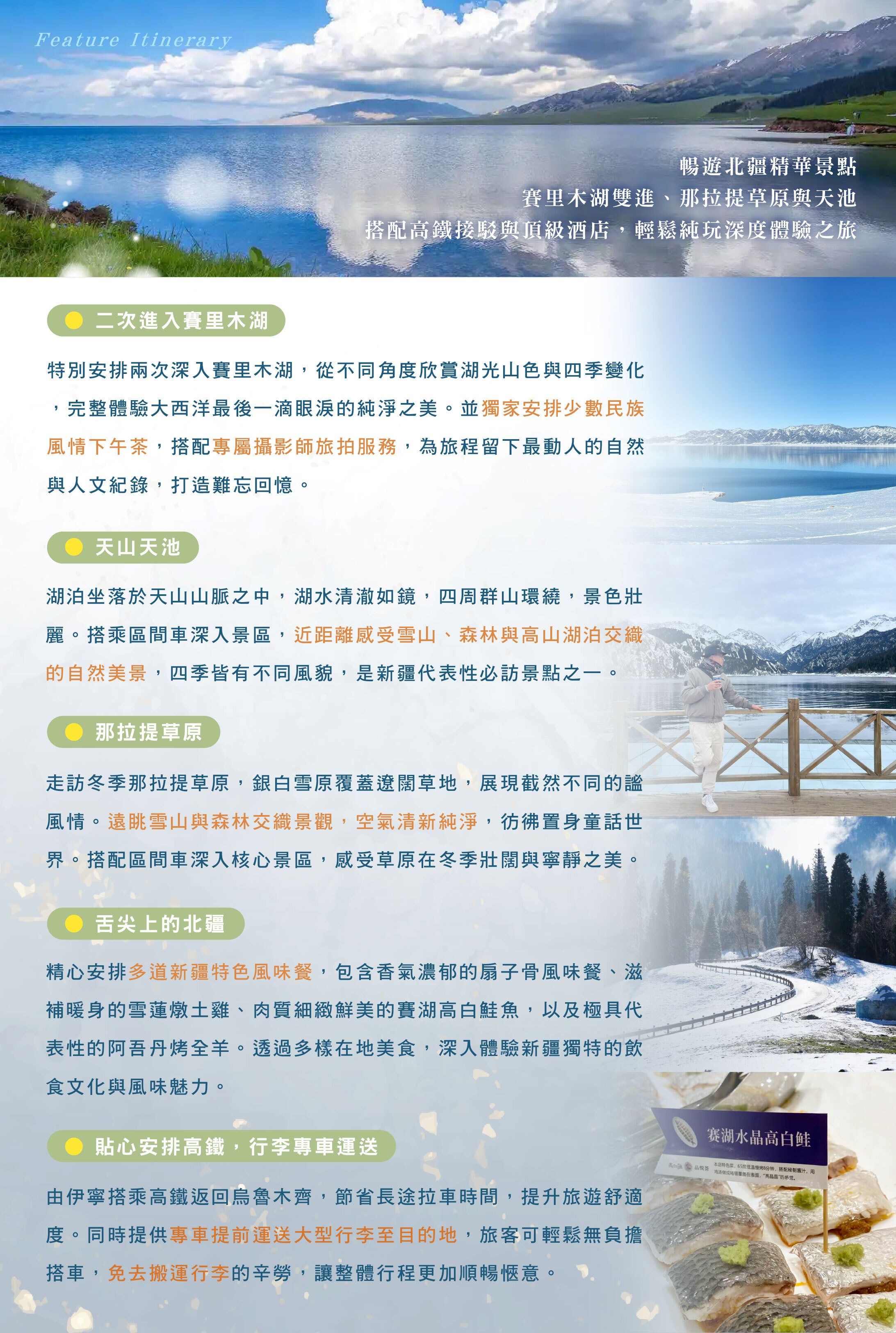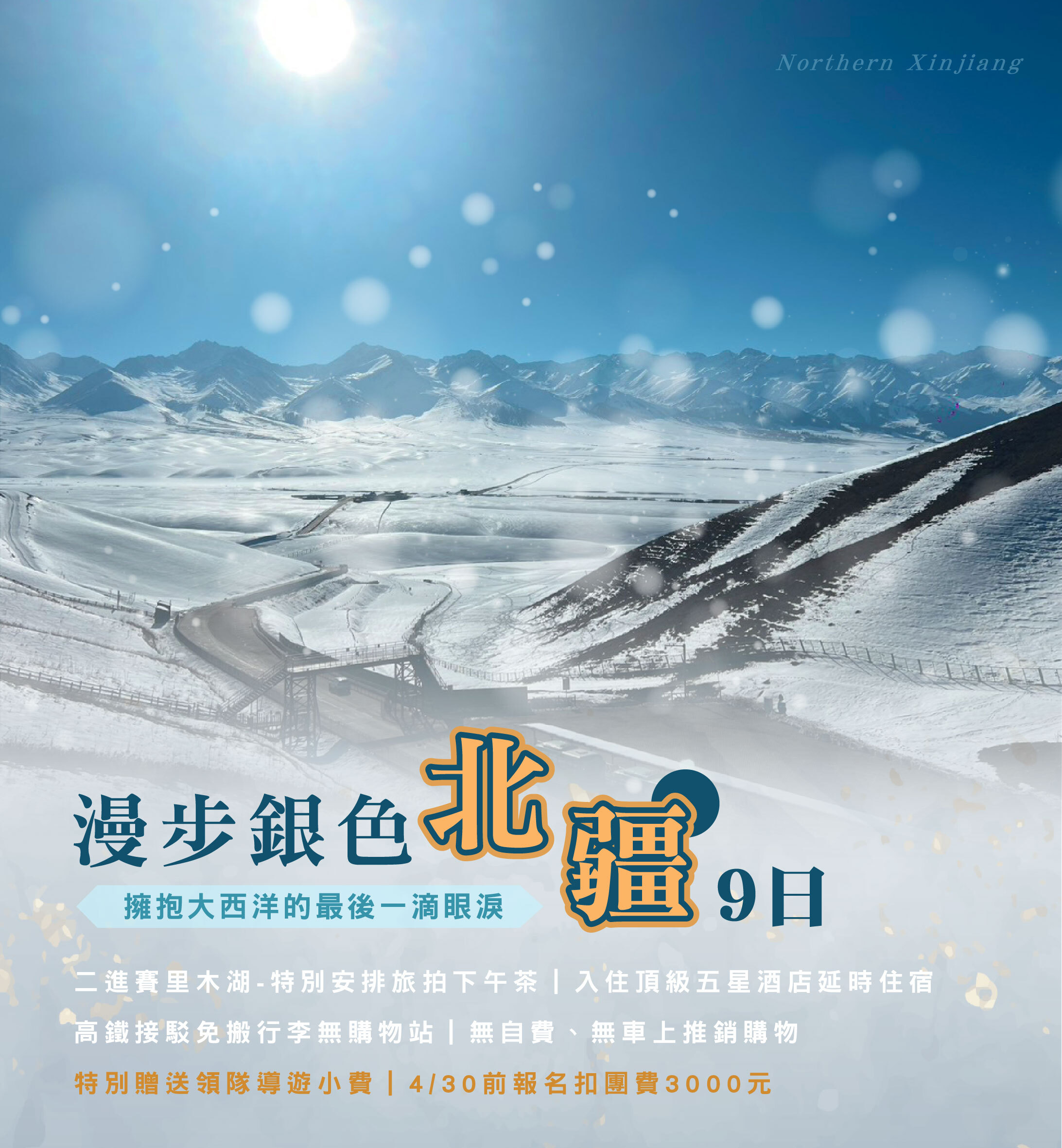 A1:許多人都說,北疆就是要夏天的時候去,藍天綠地,百花齊放,拍出來的照片堪稱世界名畫。確實,夏天北疆的美景是全球知名,但隱藏在背後的缺點卻往往會被忽略--景區塞爆的人潮、排隊浪費的時間、交通堵車的壅塞、暴漲的機票房價車資團費等等,讓旅遊整體舒適度下降了不少。如果想要更輕鬆、更划算的遊玩北疆,不妨嘗試看看冬天的時候前往,雖然看不到綠意盎然的景色、雖然溫度時常保持在0度以下、雖然早上9點天還是黑的,但許多景區的排隊亂象已經看不到,不用在萬人之中找縫隙,為自己拍一張照片;吃飯上菜、上洗手間,也都不再需要排隊等待。不僅機票價格可以花費的更少,甚至國際五星酒店都可以用一半的價格入住,CP值不僅呈現在價格更呈現在遊玩品質上。何時的產品希望讓所有人可以體驗北疆冬季獨特的美,用緩慢的步調,每天不需早出晚歸,住在地點好、等級高的酒店,讓行程外的時間也成為旅客的探險時光。