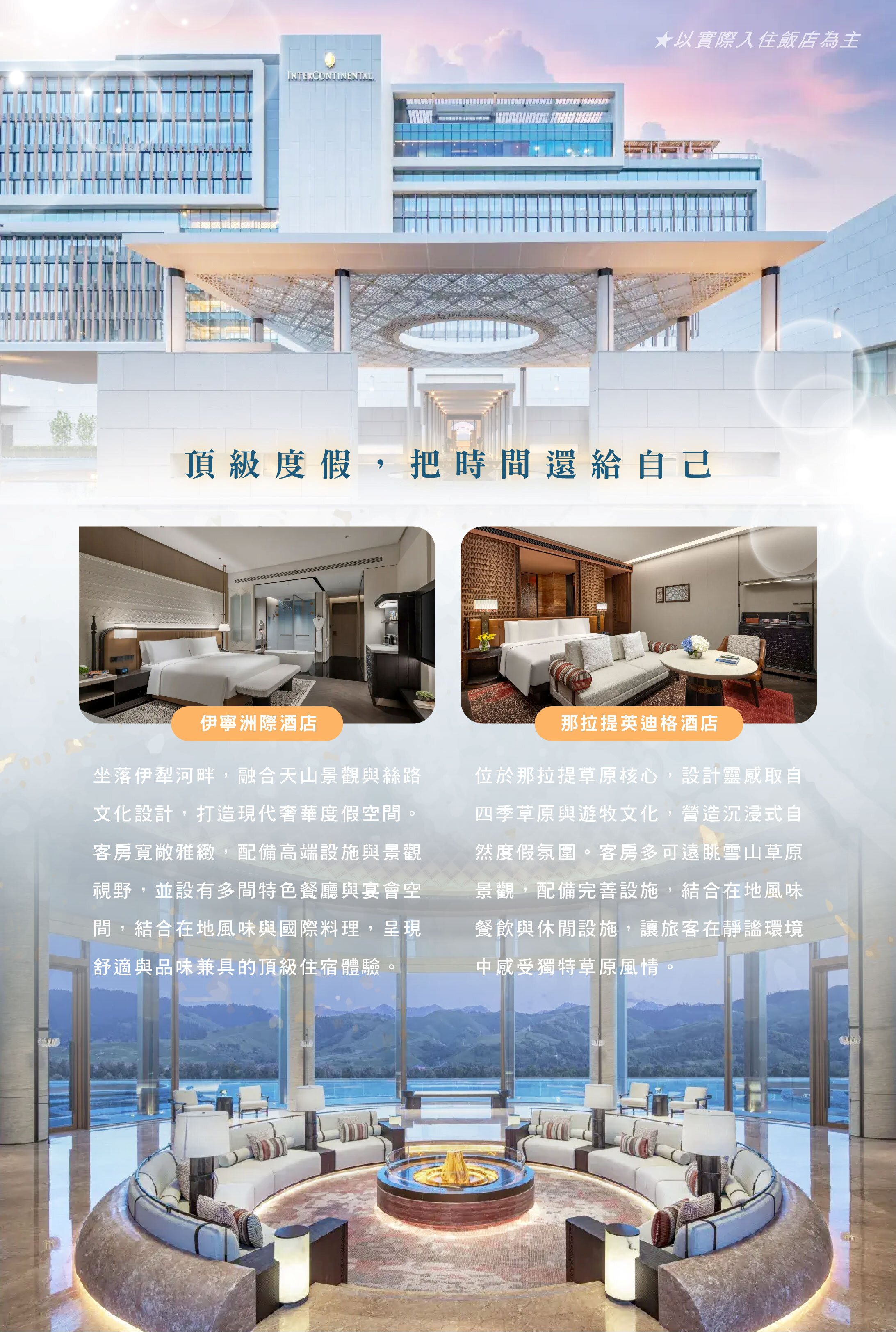 A2:伊寧洲際酒店位於伊犁河畔,早晨可在河畔步道散步享受寧靜時刻;雖然不在城市最核心的地帶,但車程15分鐘內可到達熱鬧的六星街、喀贊其,體驗伊犁地區特有的慢生活節奏。那拉提英迪格酒店在鎮上相對較邊緣的位置,但鎮子不大,車程5分鐘可抵達鎮上。建議可在酒店大廳放鬆,欣賞大片落地窗外的雪山遠景,體驗五星酒店的奢華感。