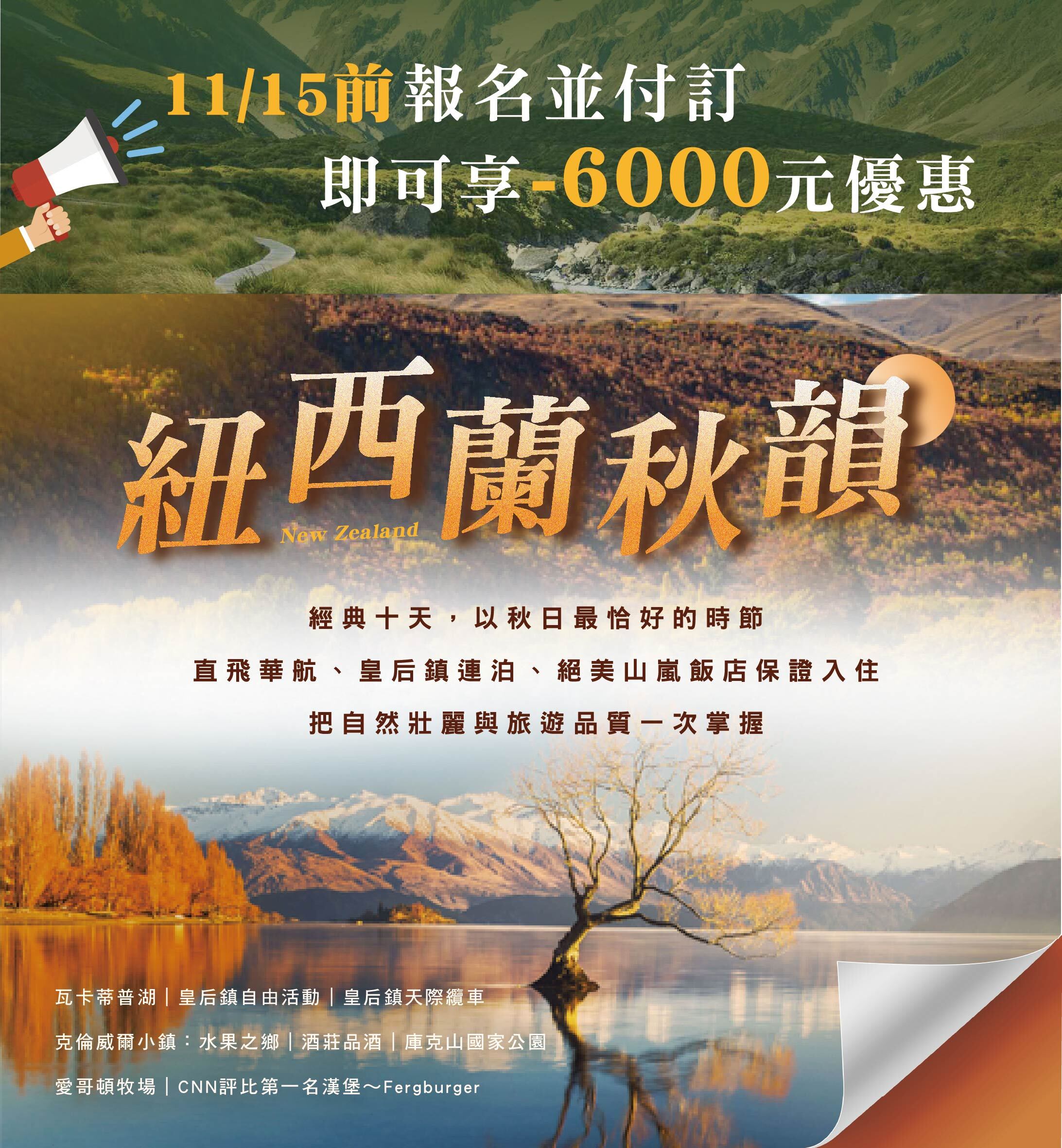 經典紐西蘭秋韻10日|以秋日最恰好的時節,直飛華航、皇后鎮連泊、絕美山嵐飯店保證入住,把自然壯麗與旅遊品質一次掌握 |