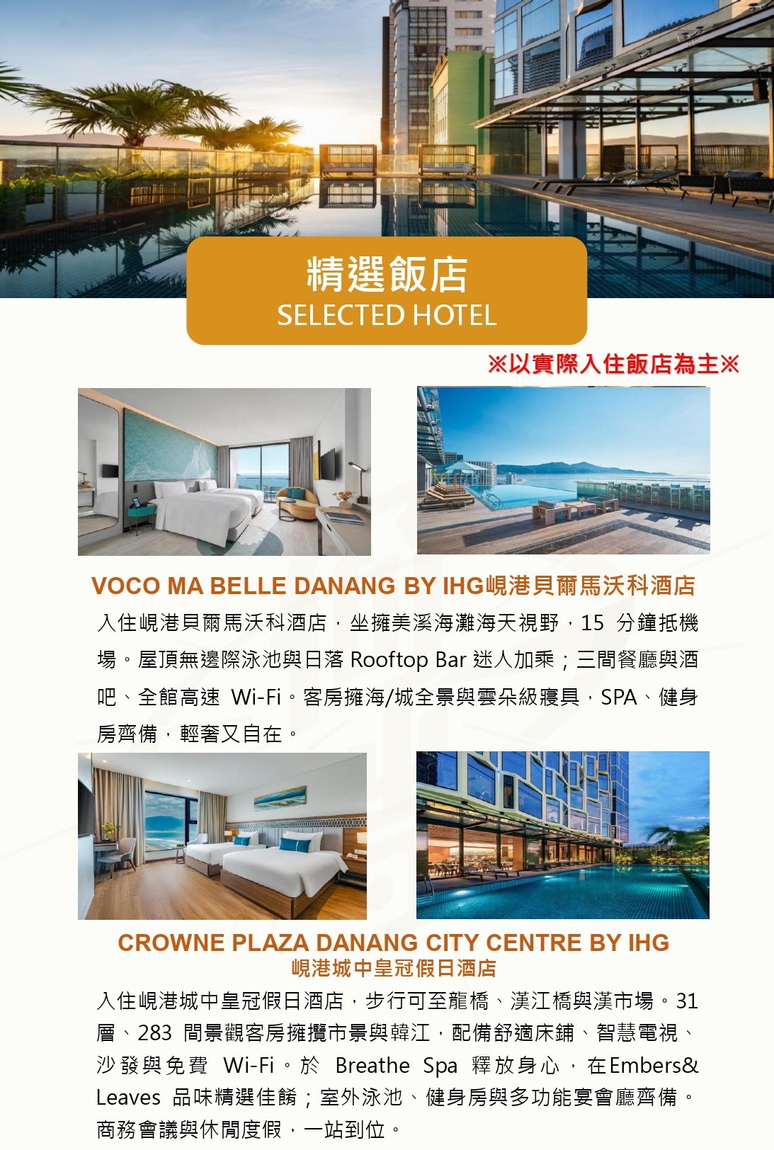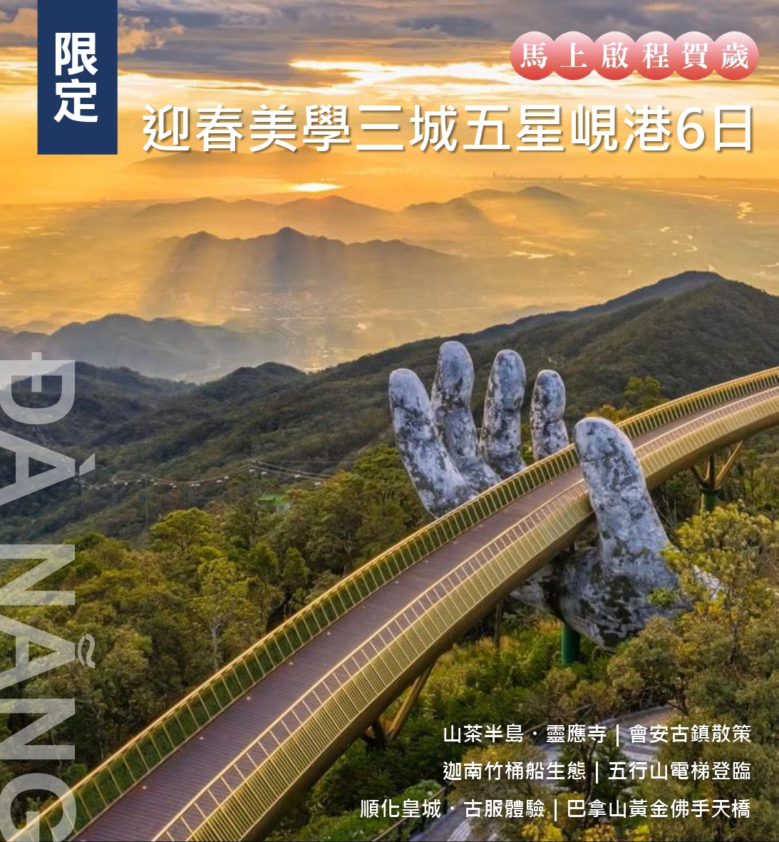 馬上啟程迎春美學三城五星峴港6日|美憬閣×VOCO雙設計酒店、登佛手橋、古鎮遊、玩竹桶船、拍順化古裝、鐵道咖啡、品龍蝦宴 |