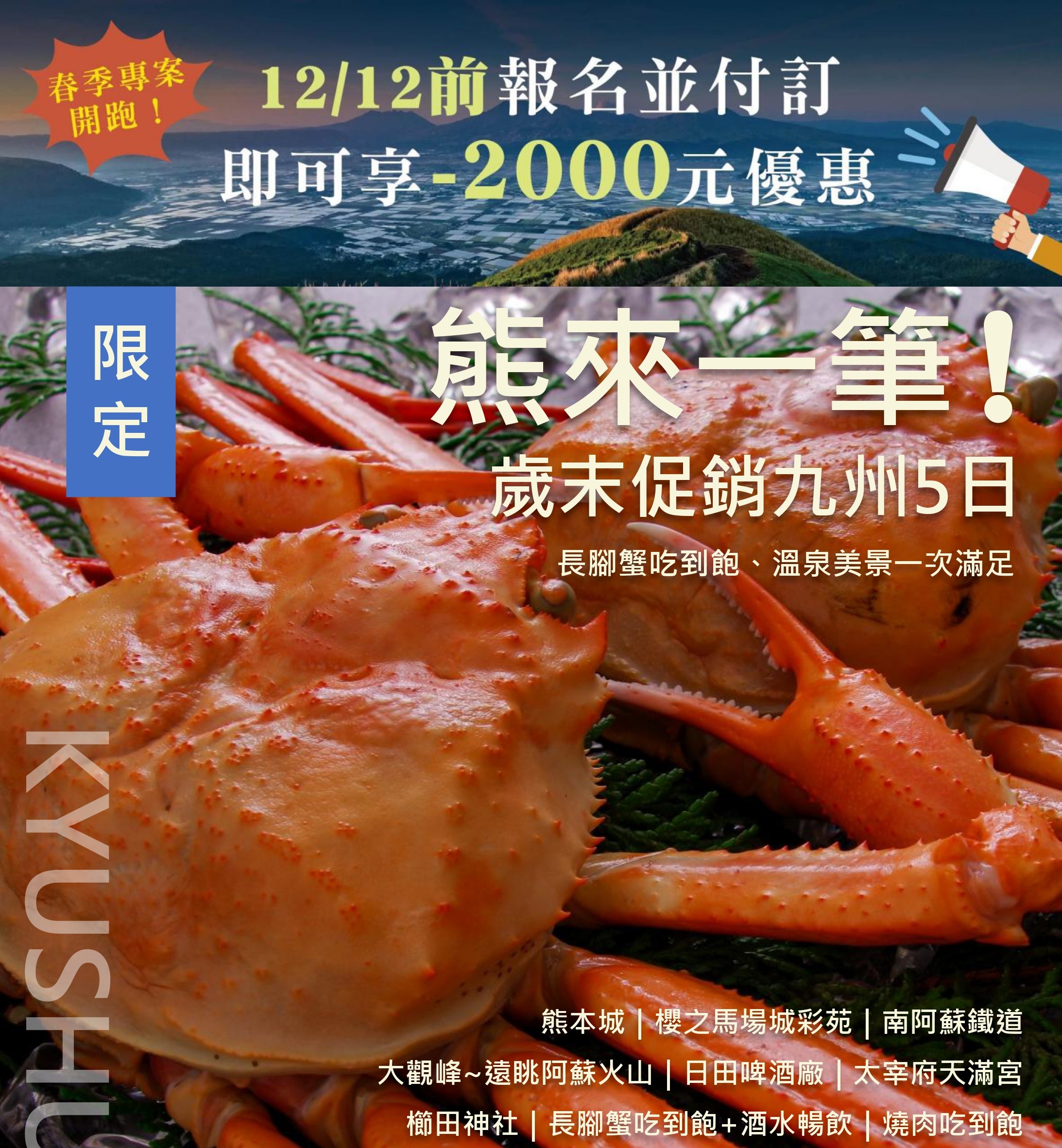 限定熊來一筆!歲末促銷九州5日|長腳蟹吃到飽、溫泉美景一次滿足。