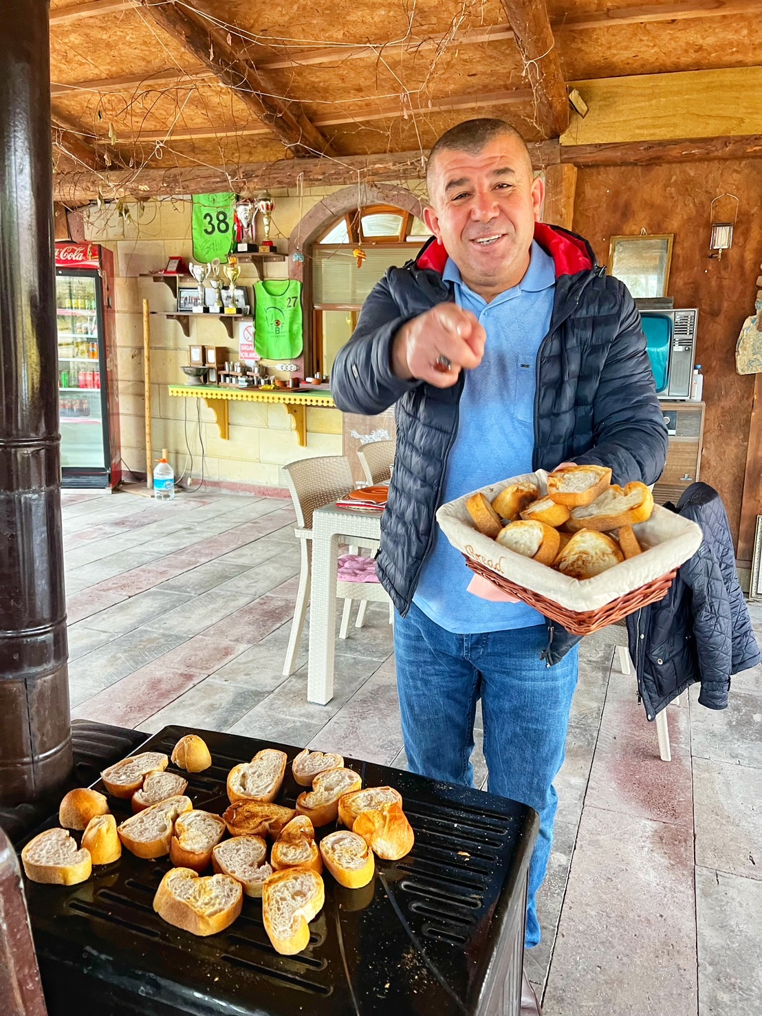 這是暖爐,竟然同時上方可以烤麵包,這位是我們的司機大哥幫大家烤香噴噴的麵包,太可愛了。