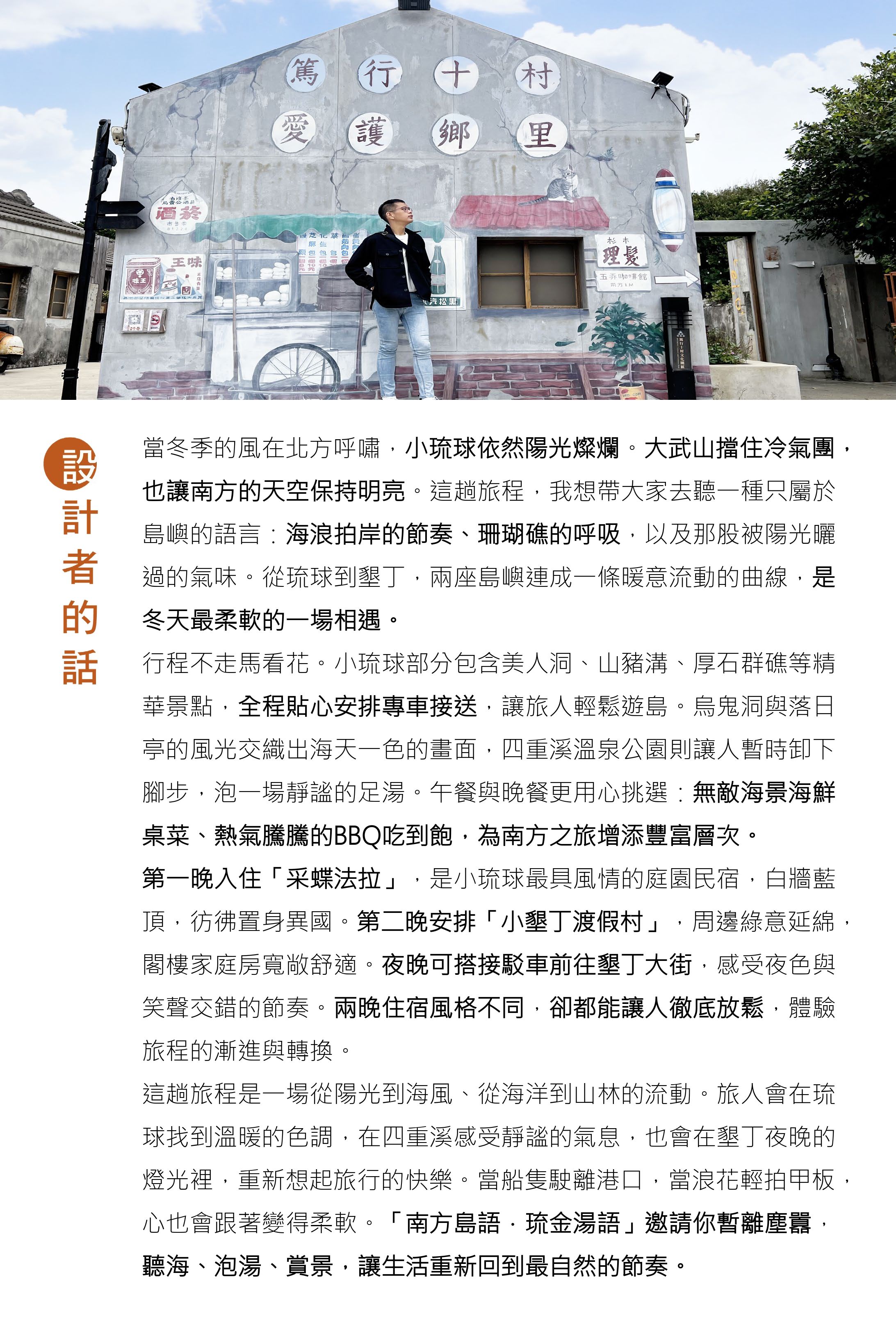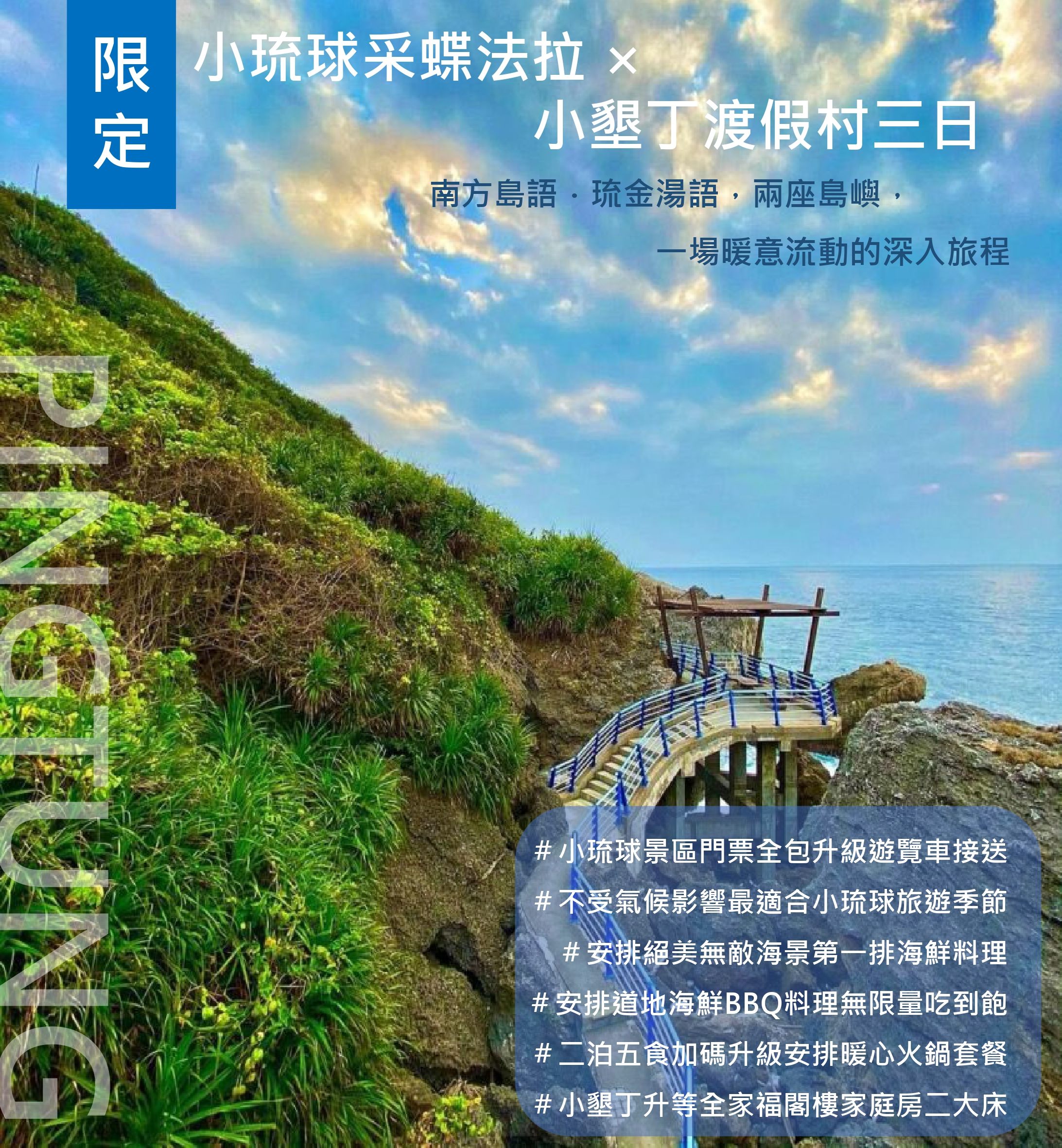 特限定小琉球采蝶法拉 × 小墾丁渡假村三日|南方島語.琉金湯語,兩座島嶼,一場暖意流動的深入旅程 | 10 | NT$6,499 | 可報名 |