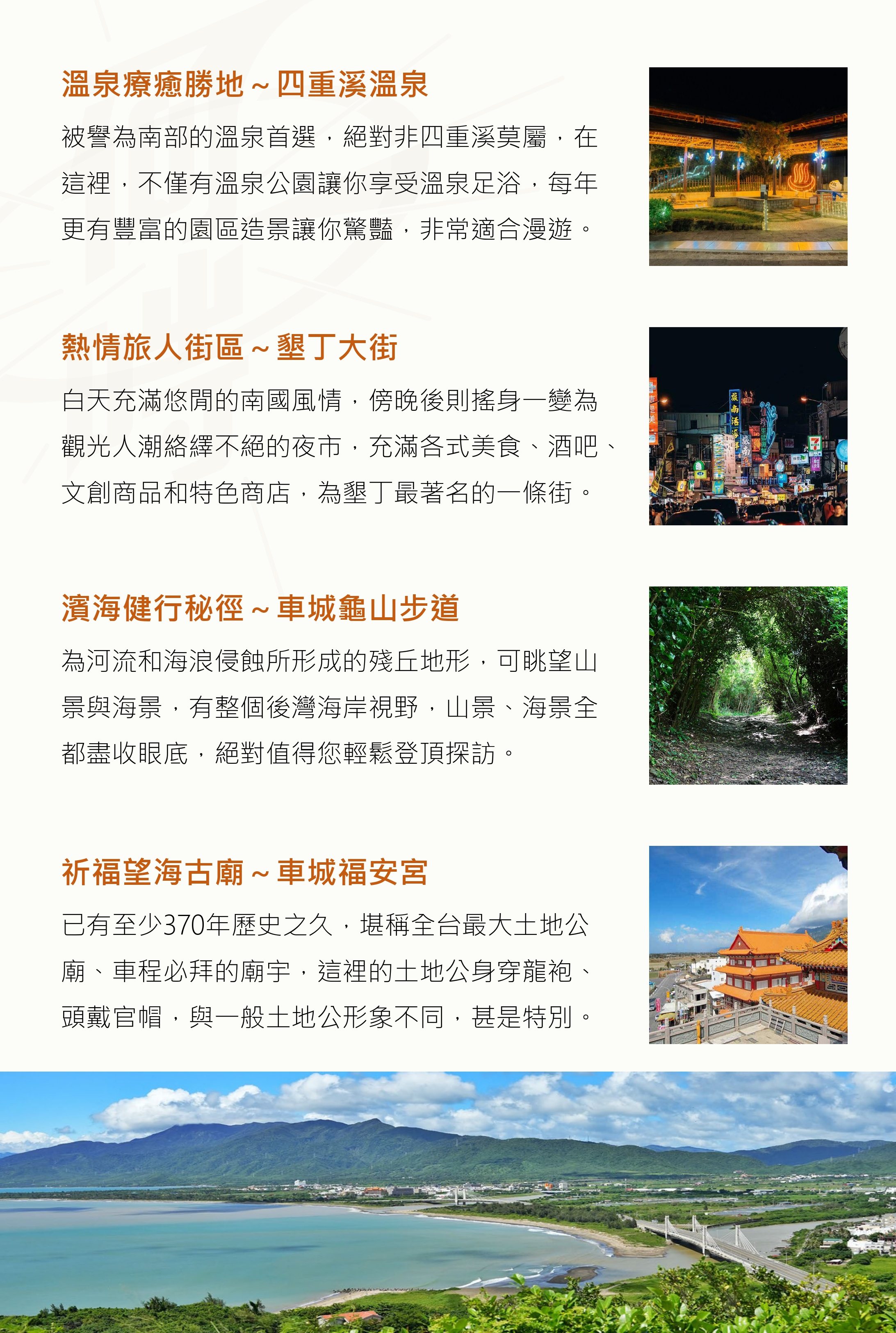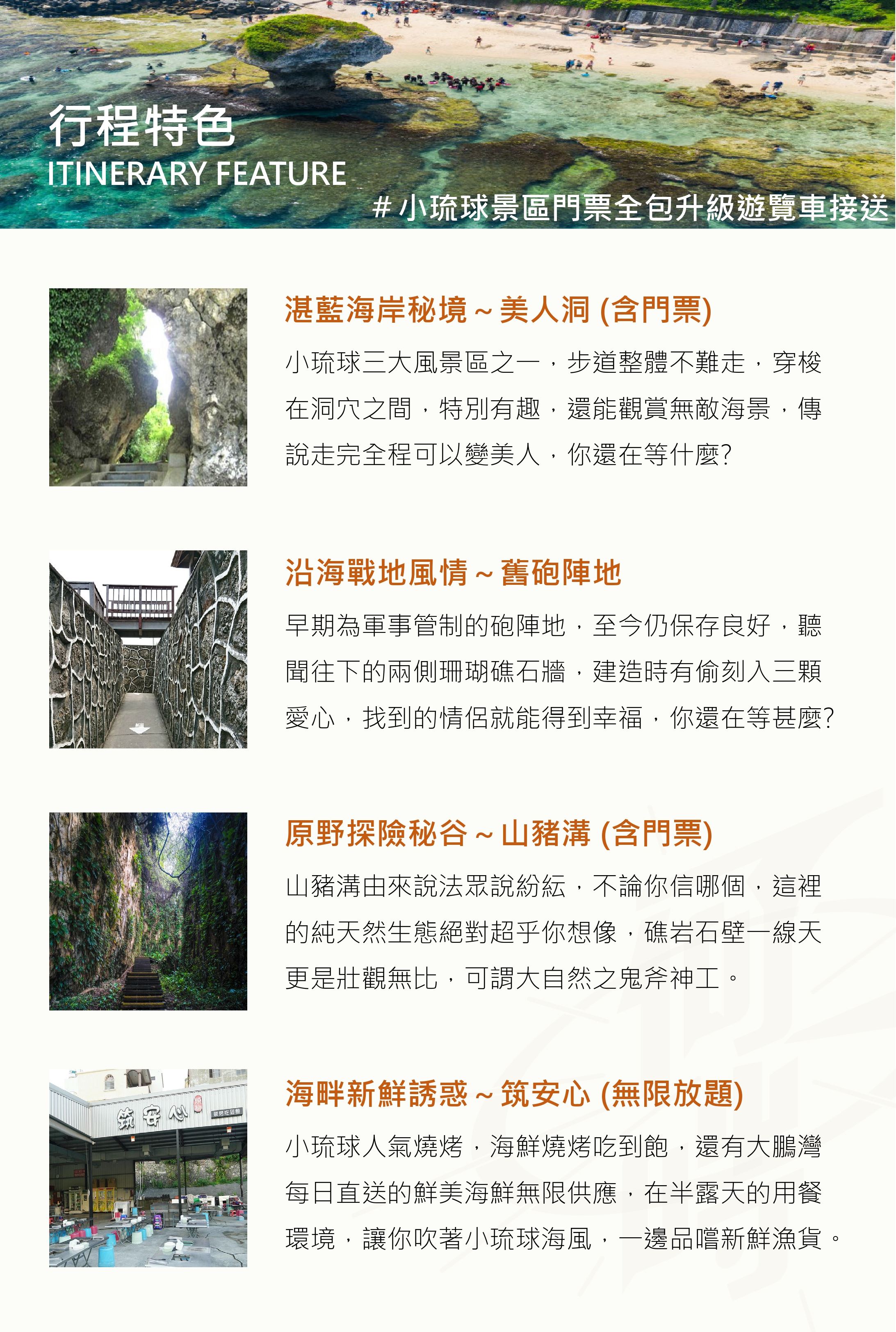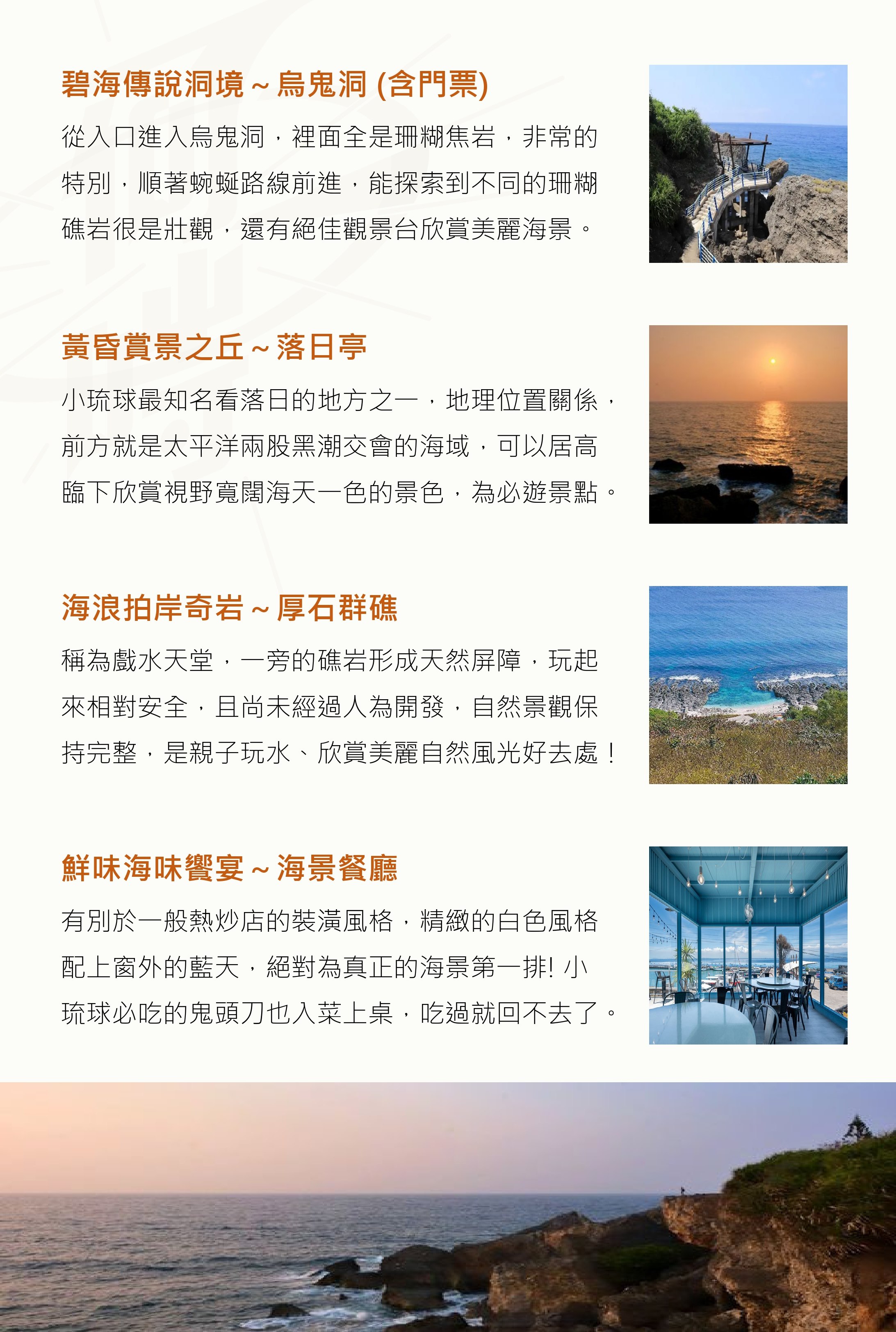 ※小琉球升級遊覽車為四排座椅,屬接駁輪轉車,點跟點之間可能不會是同一台車,上下車需要攜帶隨身物品(何時報名線上選位系統不包含小琉球,小琉球當地遊覽車不劃位)