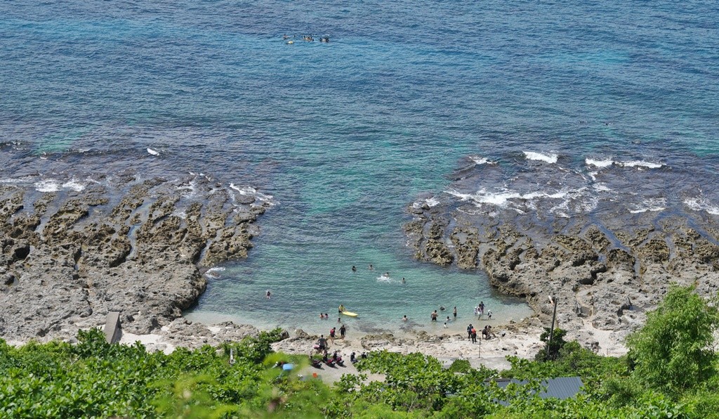這裡的景觀跟島上其他地方截然不同。雖然礁石多,卻隱藏著幾處秘境小沙灘,沙質純白細緻,對比著超級湛藍的海水,色彩對比強烈到像是P圖出來的!因為海水清澈度極高,非常適合戲水。礁石形成的潮間帶,藏著許多海洋小生物。如同大型豐富生態區。