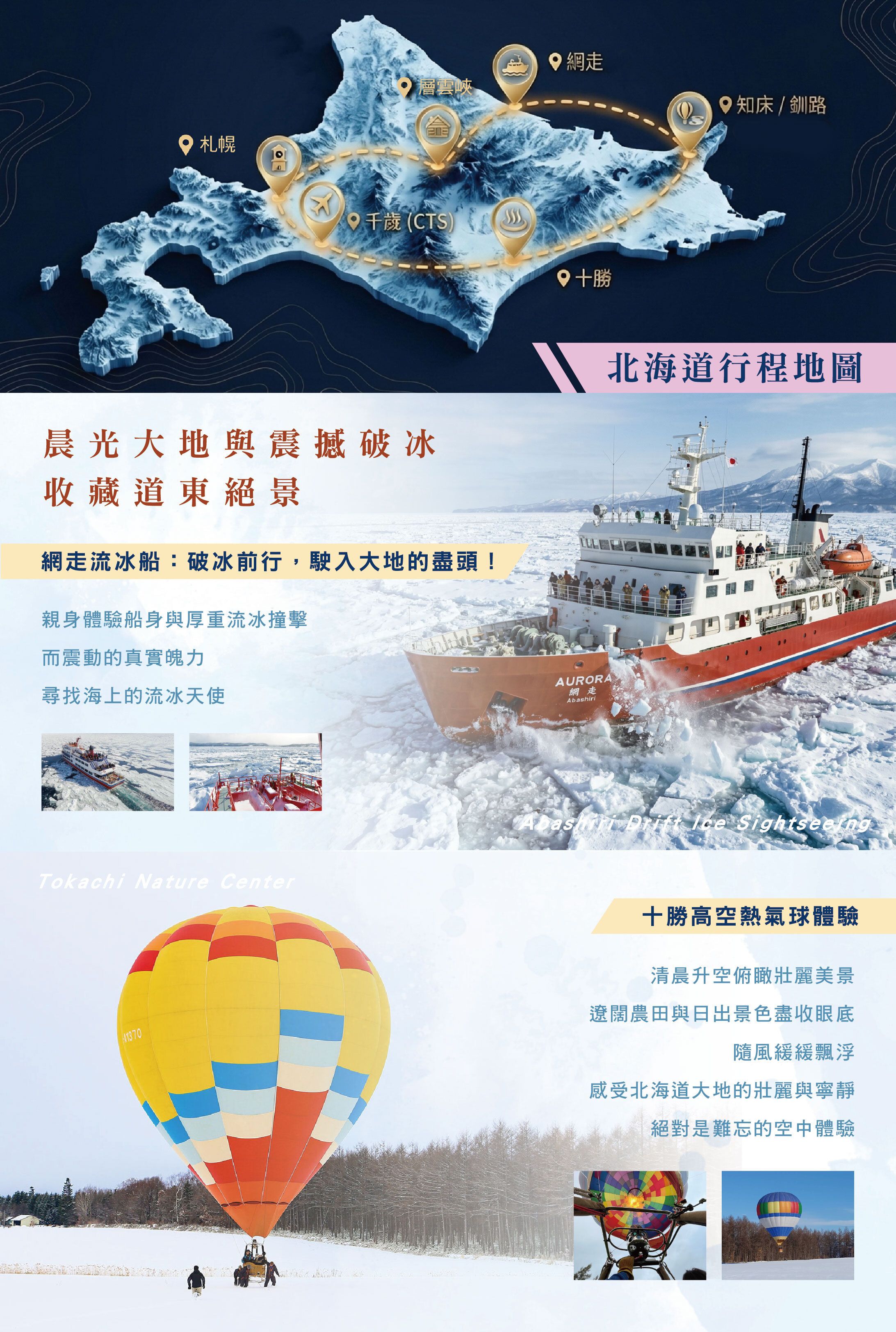 A: 因為欣賞流冰的視角,一個都不能少!何時旅遊在設計行程時最講究「層次感」與「體驗感」。我們先帶您搭乘流冰物語電車,以悠哉的視角看著車窗外那片無垠的白色冰原,享受鐵道旅行的文青浪漫;接著換乘破冰船 AURORA 號,親自感受船體撞擊巨大流冰的震撼魄力!一靜一動,陸海雙拼,保證讓您的流冰體驗毫無死角,不留遺憾。