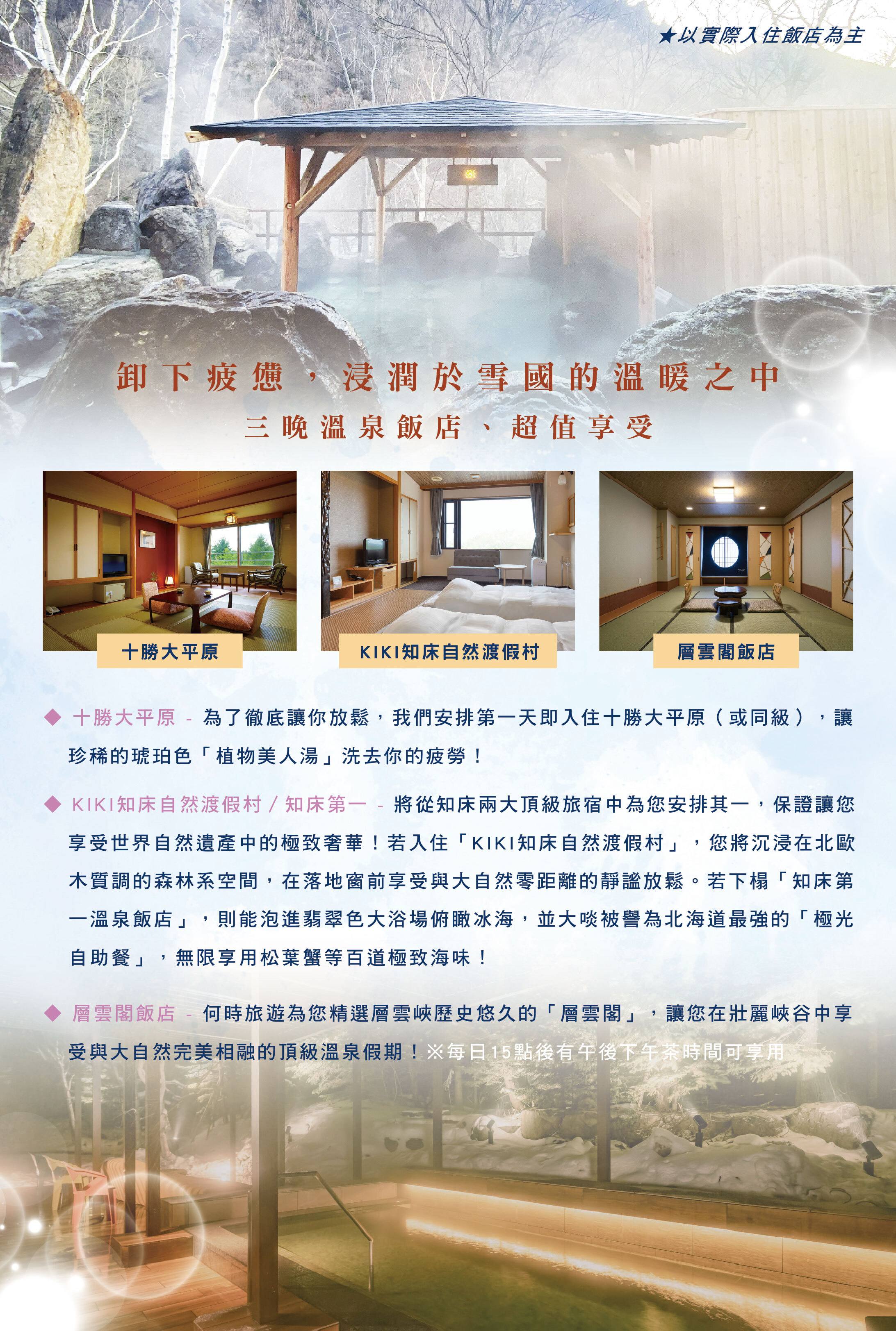 A: 何時旅遊最重視的是客人「休假的放鬆感」!第一天出發,搭機難免疲憊,與其在喧囂的市區走馬看花,不如直接遁入北海道大自然的懷抱。十勝溫泉擁有世界稀有的「植物性美人湯」,洗完肌膚超滑順!加上晚餐特別安排當地人引以為傲的「豊西牛陶板燒」,用入口即化的頂級和牛與溫泉洗去您一身的疲勞,為接下來的雪國探險完美開機!