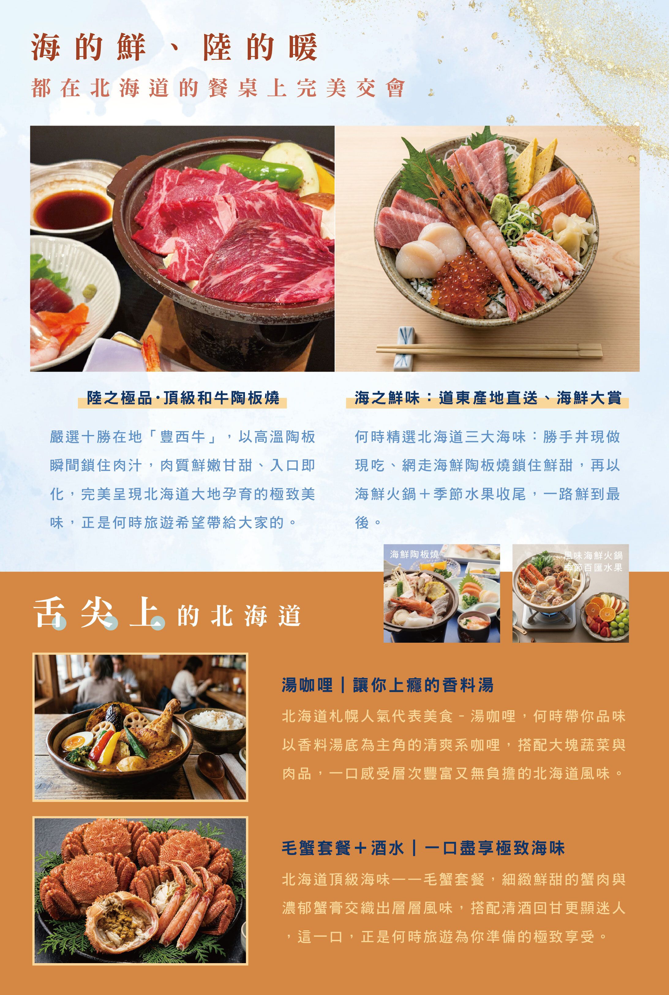 冬遊北海道怎能少了靈魂火鍋?我們精心安排了海鮮火鍋,讓熬煮出的滿滿海味高湯與在地鮮蔬的清甜,熱湯下肚從胃暖到指尖!我們更準備了「季節水果放題」讓您無限爽吃!大啖鮮美火鍋後,盡情享用溫差孕育出的高甜度當季水果,完美平衡味蕾。這種冰火交疊、鮮甜交織的澎湃吃法,保證身心靈大滿足!